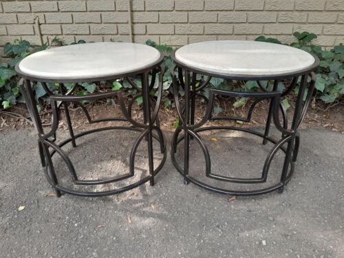 A Pair Of Geometric Design Metal Side-Tables With Patina And Cream Marble Top