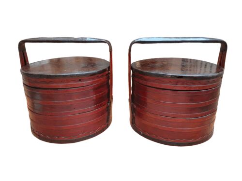 A 20th Century Pair Of Chinese Lacquered Bamboo Picnic Boxes With Handles
