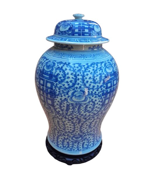 An Antique 19th Century Chinese Blue / White Jar with Cover Qing Dynasty on Wooden Stand