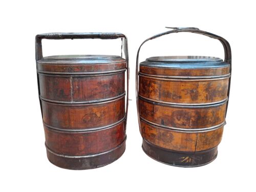 A 20th Century Pair Of Chinese Painted Lacquer Containers Mounted With Brass Handles