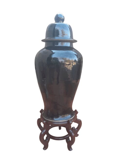 A Large Size Black Ceramic Ginger Car With Cover On A Chinese Wooden Stand