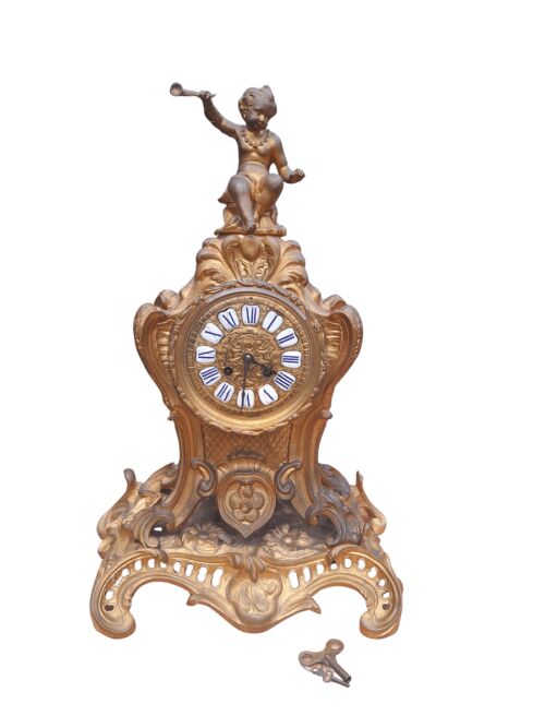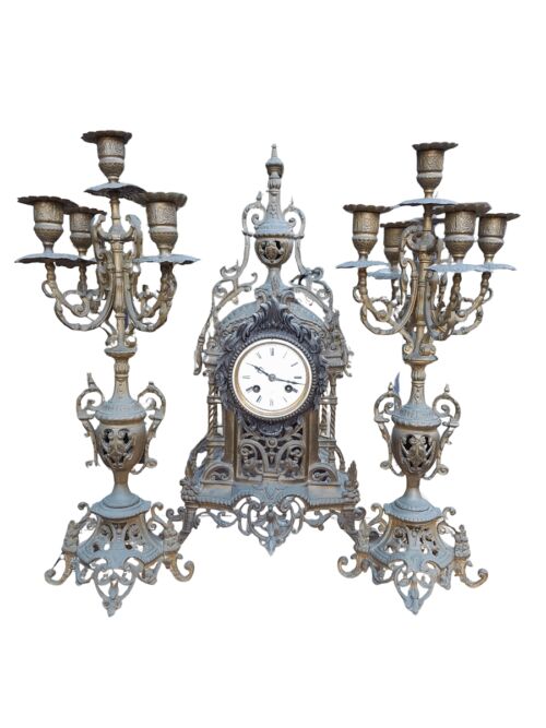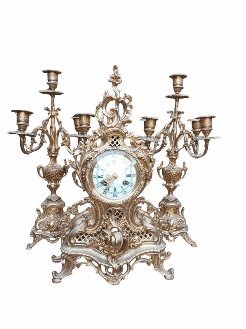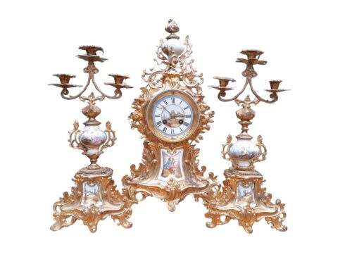 An Antique Century French Rococo Style Clock Garniture Set with Pair of Candelabras with Pendulum and Key