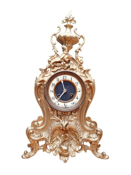 An Antique 19th Century French Rococo Gilt Ormolu Clock Garniture Set with a Pair of Matching Candelabras