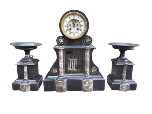 An Antique 1900Â’s Victorian Black Marble Clock With Mercury Compensation Pendulum Garniture Set With Pair Candle Holders