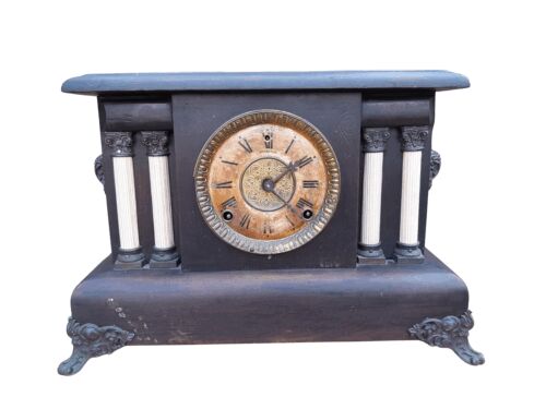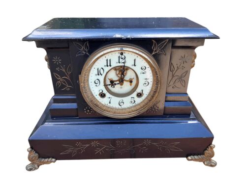 An Antique Victorian Ansonia Gilt Metal, Black Lacquer Chiming Working Clock with Key