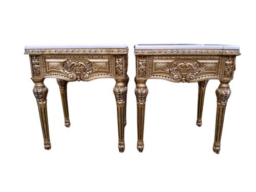 A Pair Of French Style Ornately Carved Marble Top Side Tables With 1 Drawer