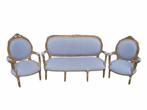 A French Style Giltwood Ornately Carved Settee With A Pair Of Matching Armchairs