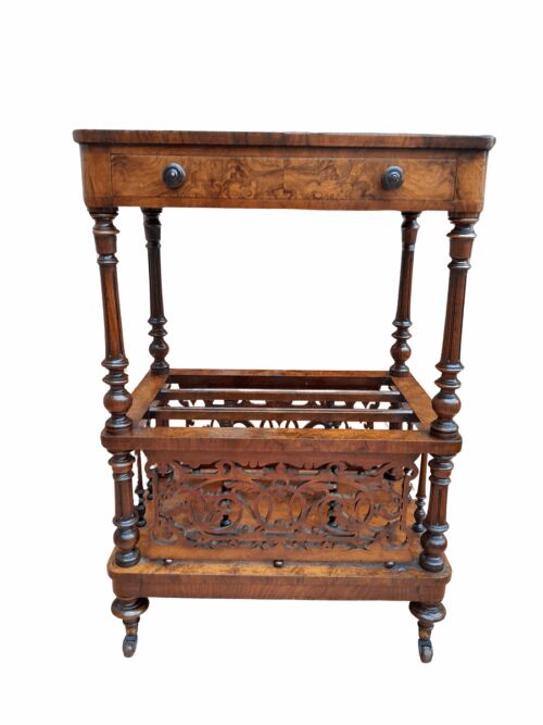 An Antique Mid 19th Century Victorian Burr Walnut Canterbury with Gallery and on Castors
