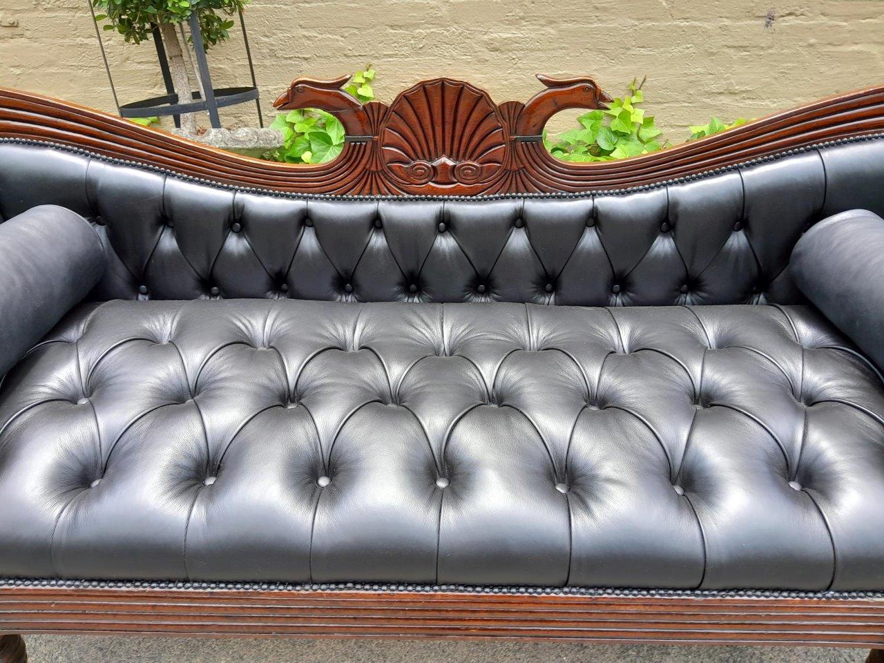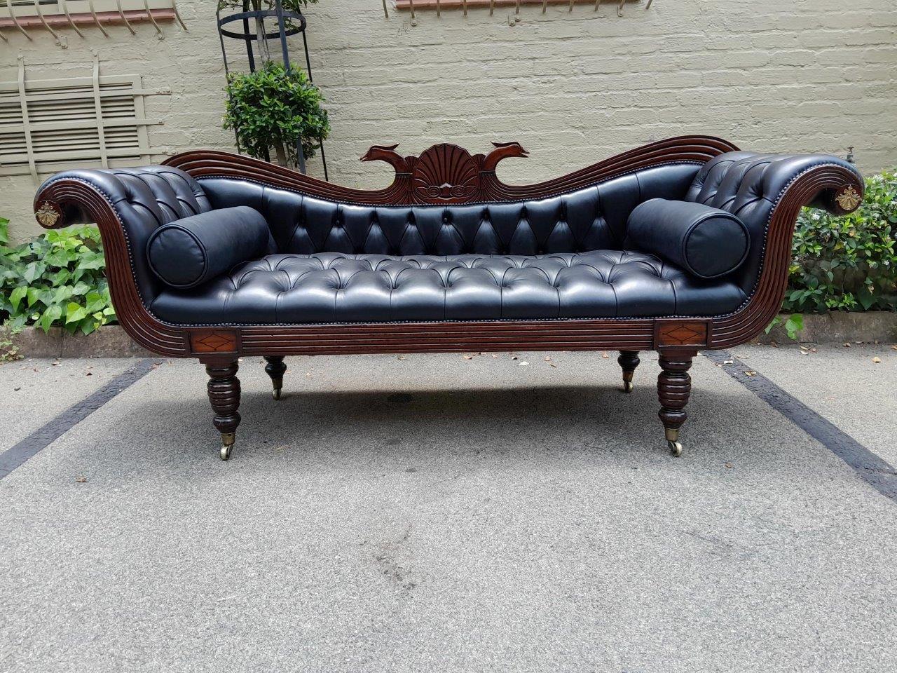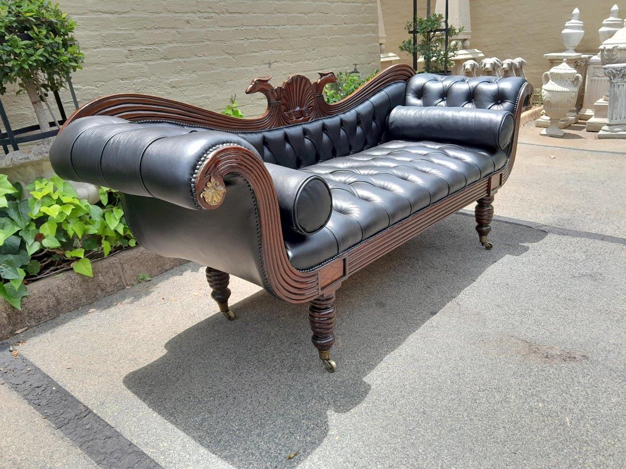 A 19th Century Circa 1840’s Colonial Ornately Carved Cedar Wood Settee With Inlay Detail And On Castors  Upholstered In Deep Buttoned Leather