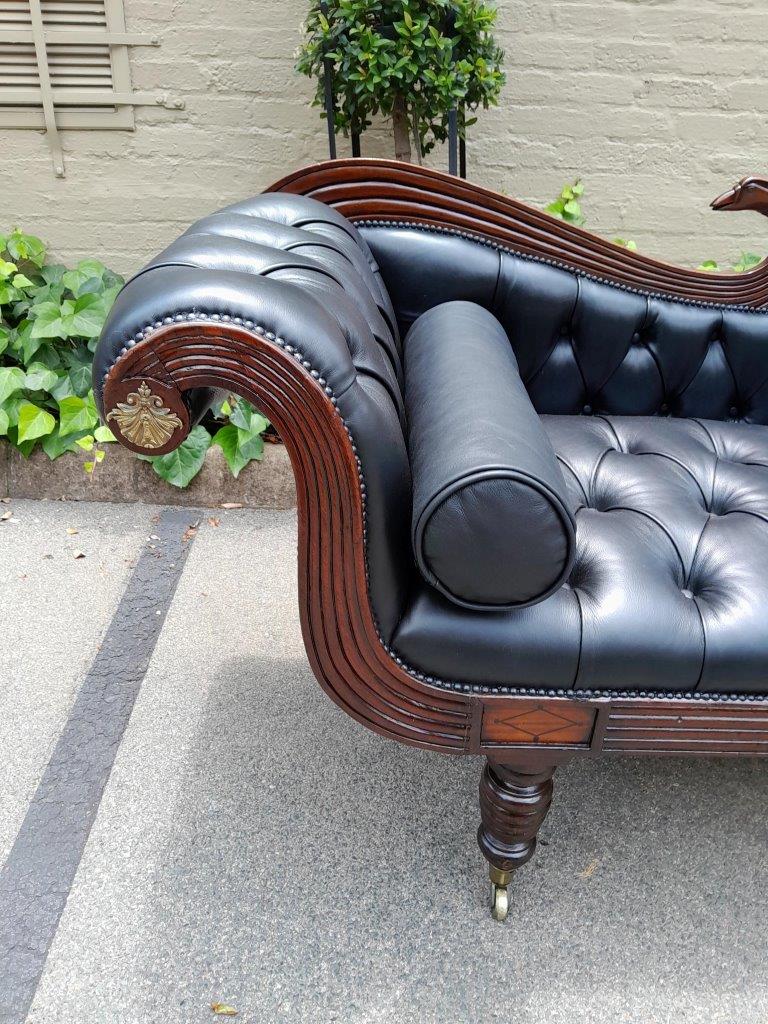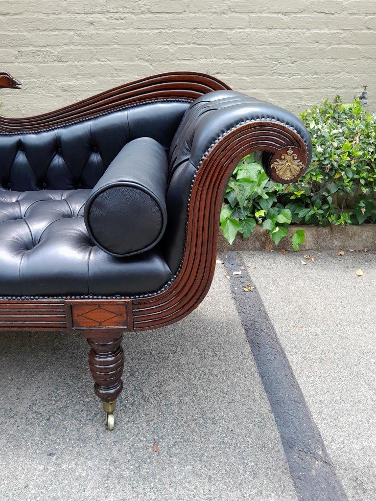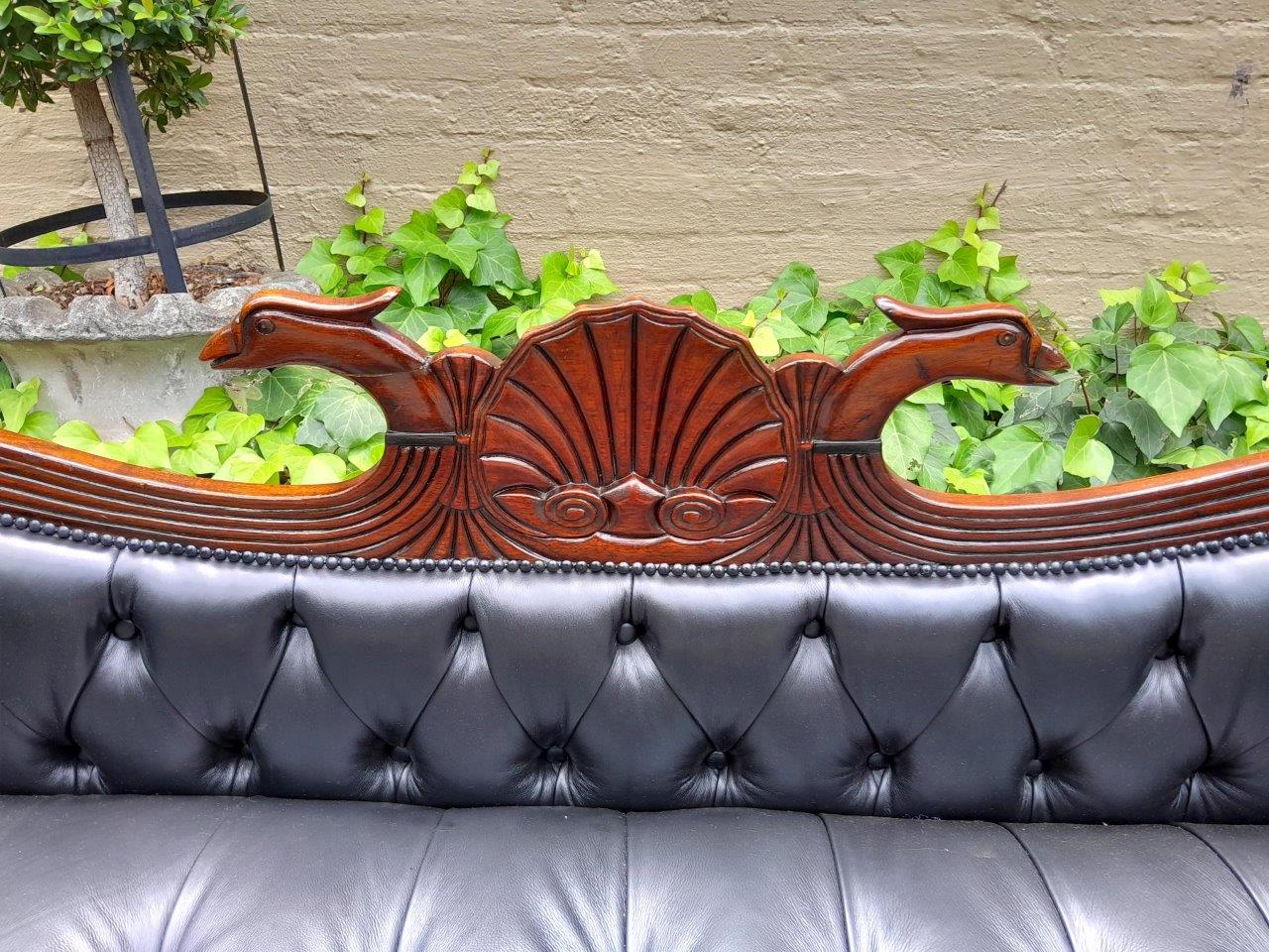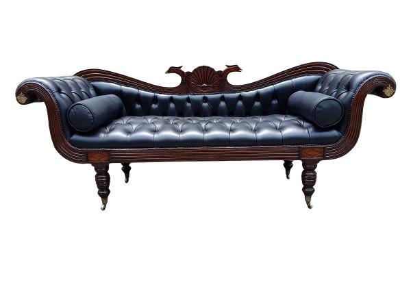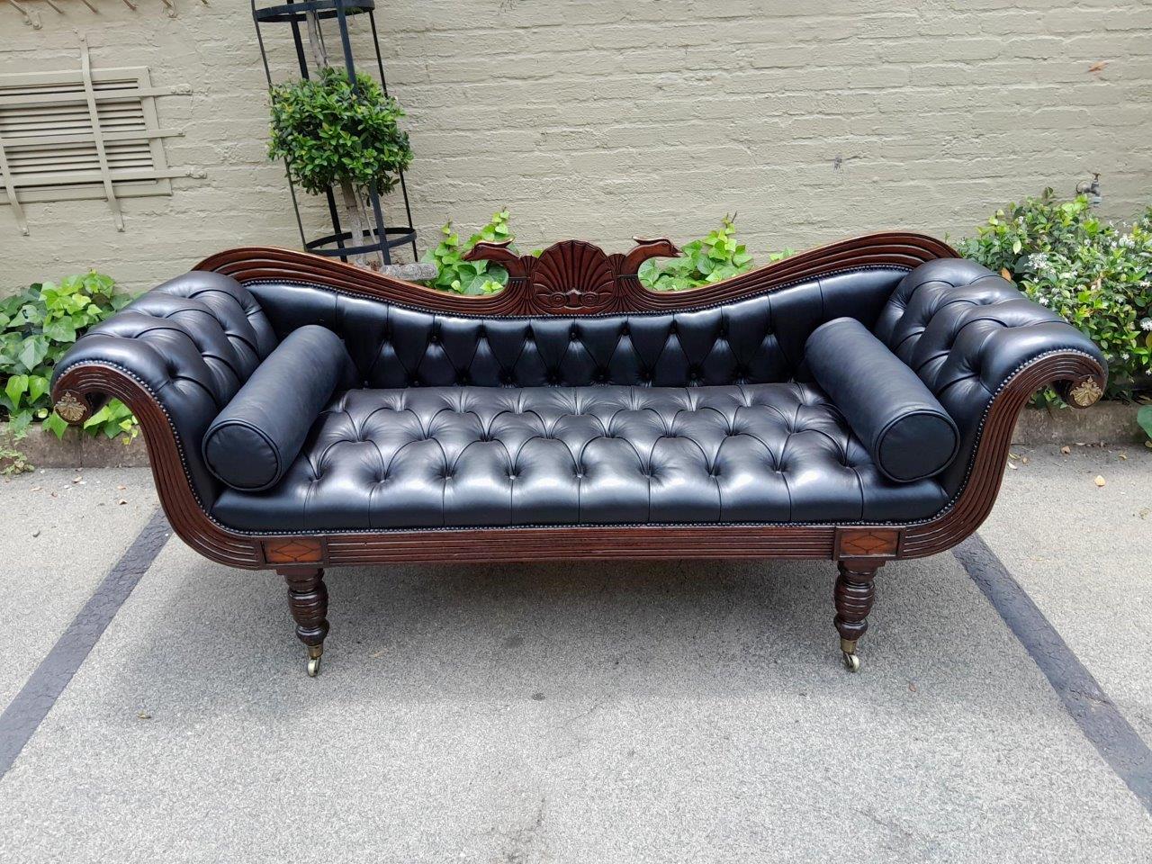 A 19th Century Circa 1840’s Colonial Ornately Carved Cedar Wood Settee With Inlay Detail And On Castors  Upholstered In Deep Buttoned Leather