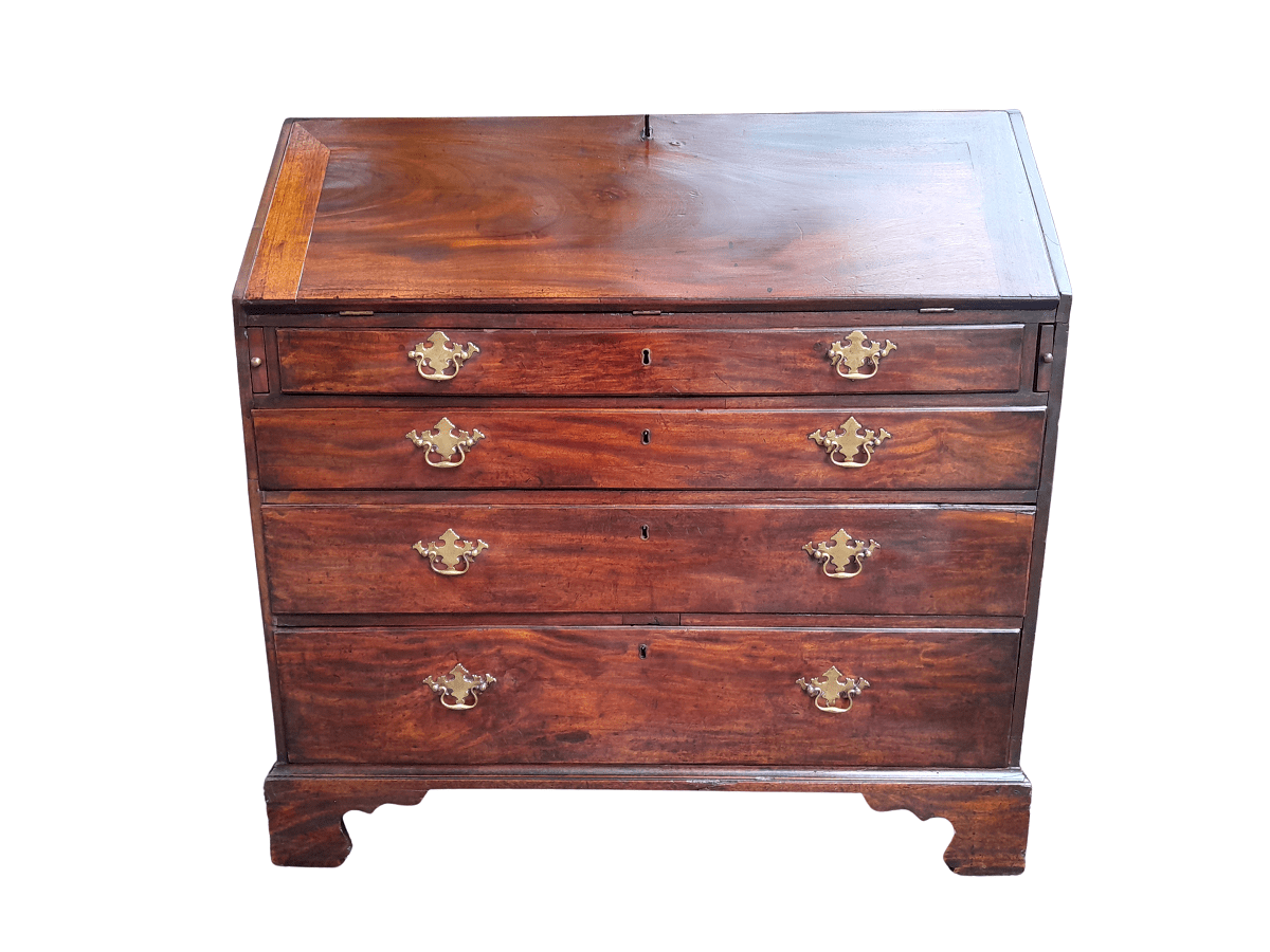 A 19th Century / Circa 1850 Mahogany Secretaire Chest Of Drawers With Brass Handles And Original Brass Cut Escutcheons And Handles With Lock And Key Dimensions: 113cmh X113cmw X 58cmd