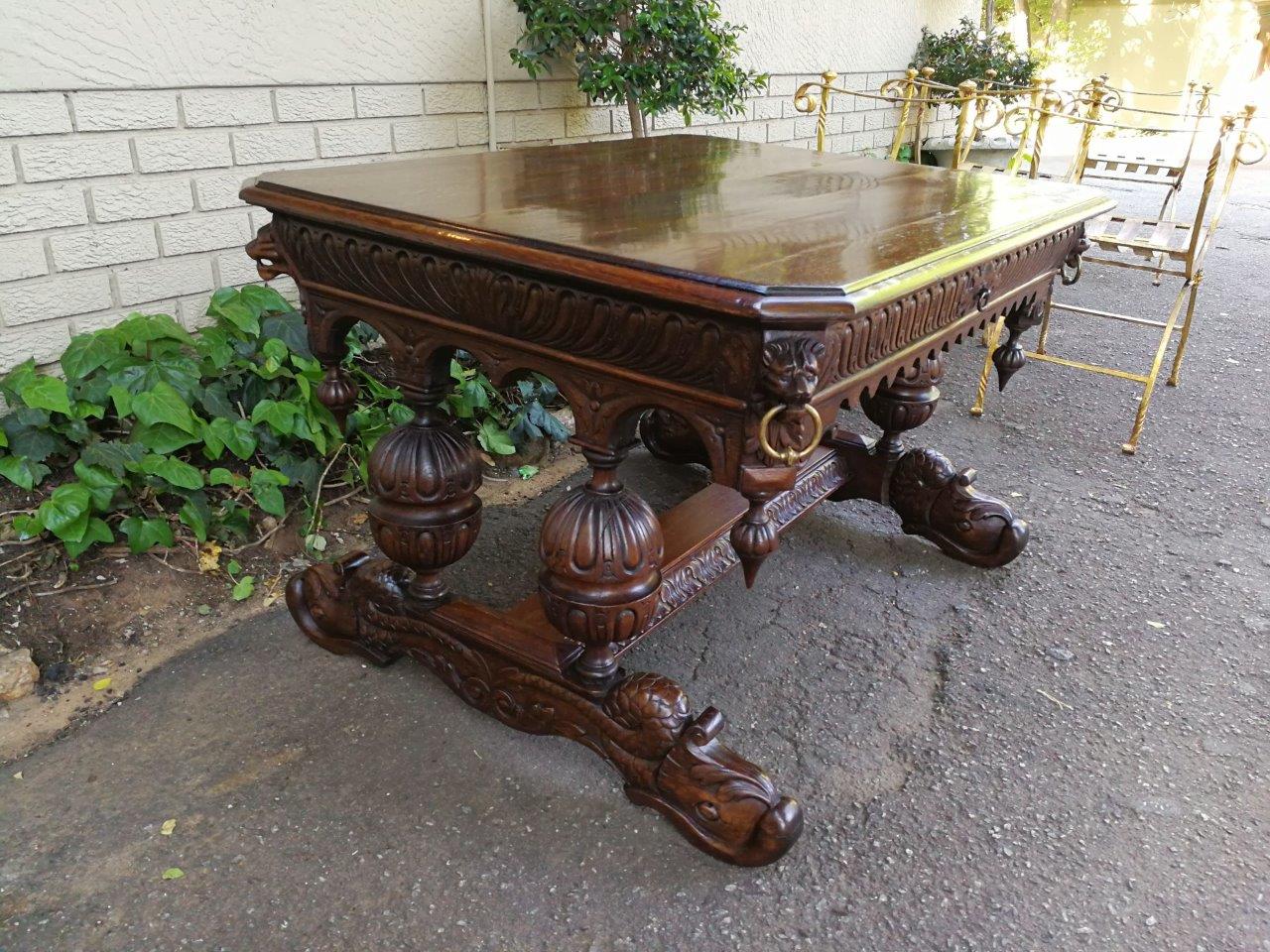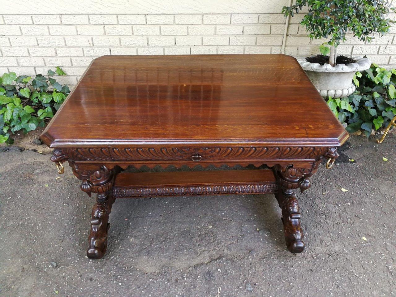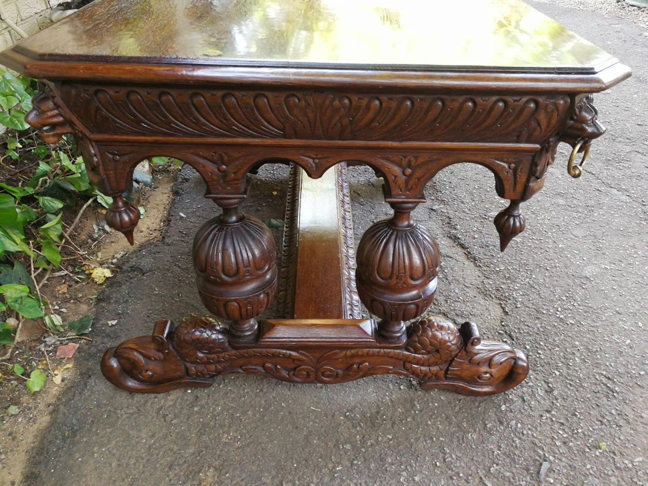A 19th Century Circa 1879 French Dauphine/Dolphin Carved Oak Desk or Library/DrinksTable with Drawer