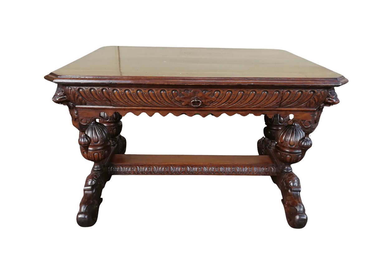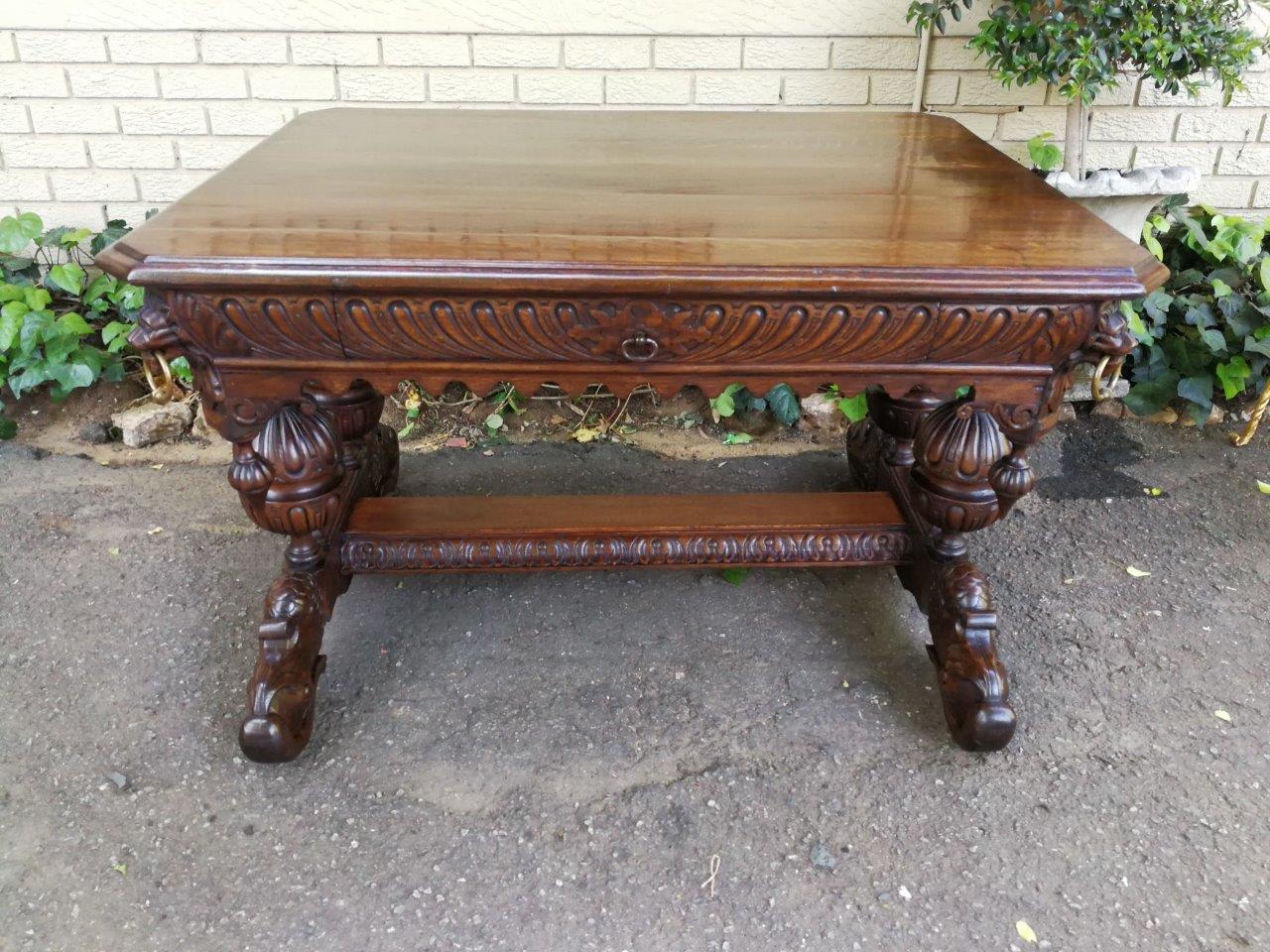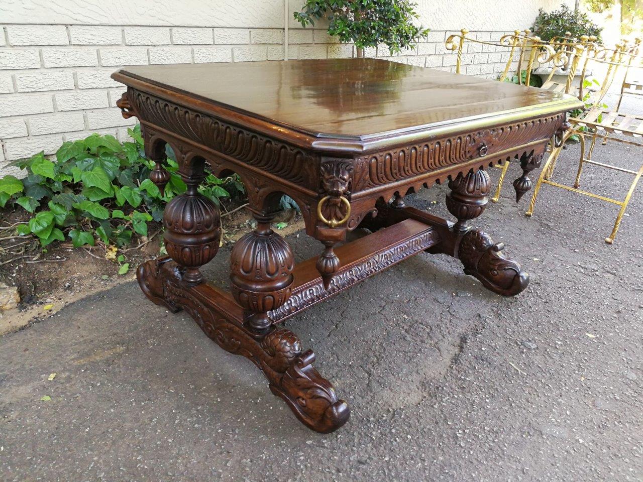 A 19th Century Circa 1879 French Dauphine/Dolphin Carved Oak Desk or Library/DrinksTable with Drawer