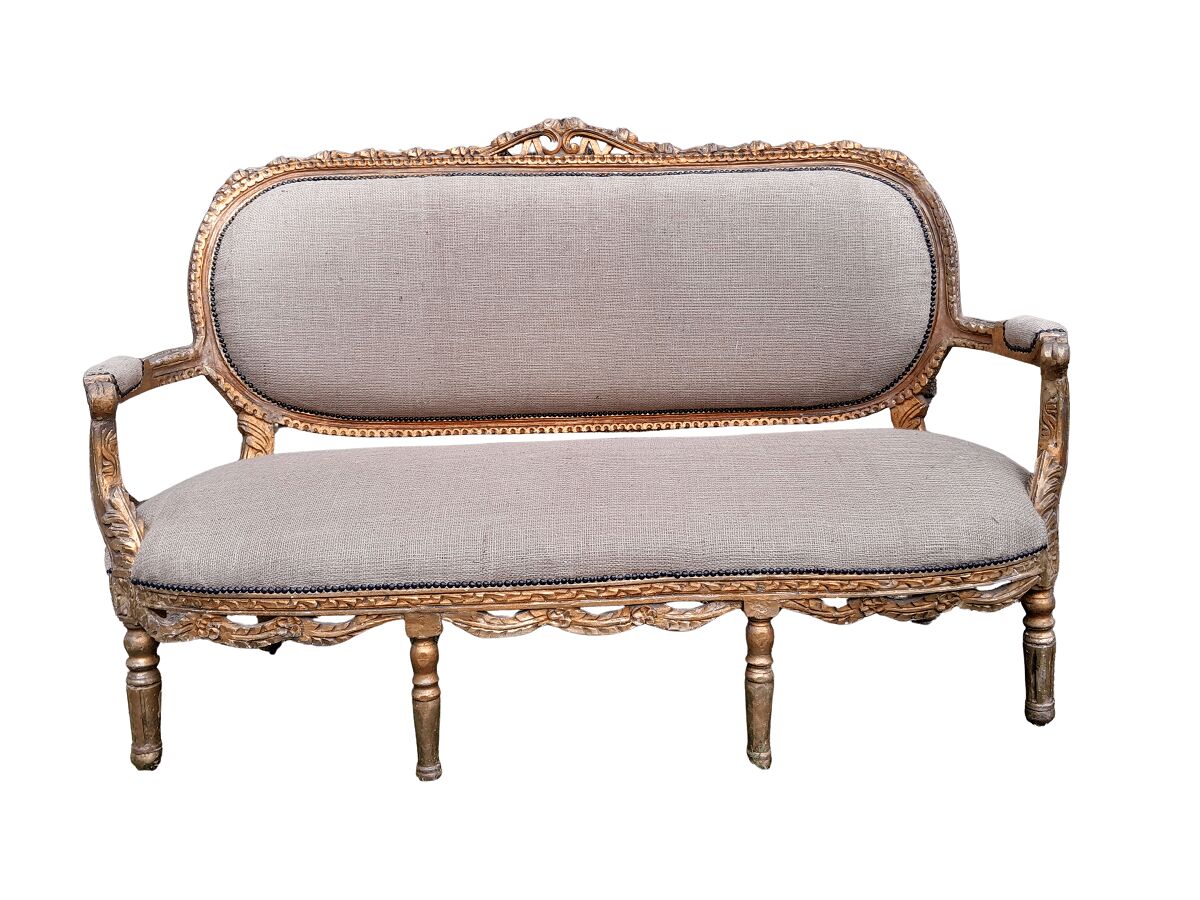 A 19TH Century Circa 1880 French Carved Giltwood Settee Upholstered In A Contemporary Hessian Fabric