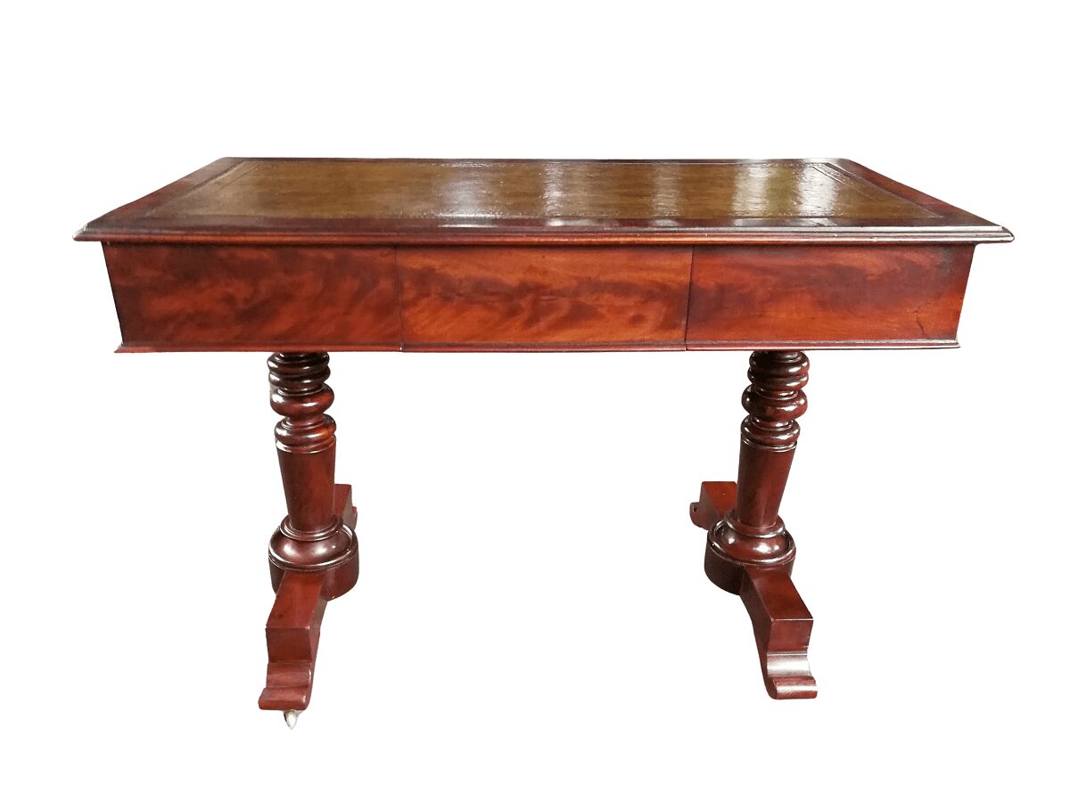 A 19th Century Flamed Mahogany Sofa / Writing Table with Leather and Hand Tooled Top On Cators
