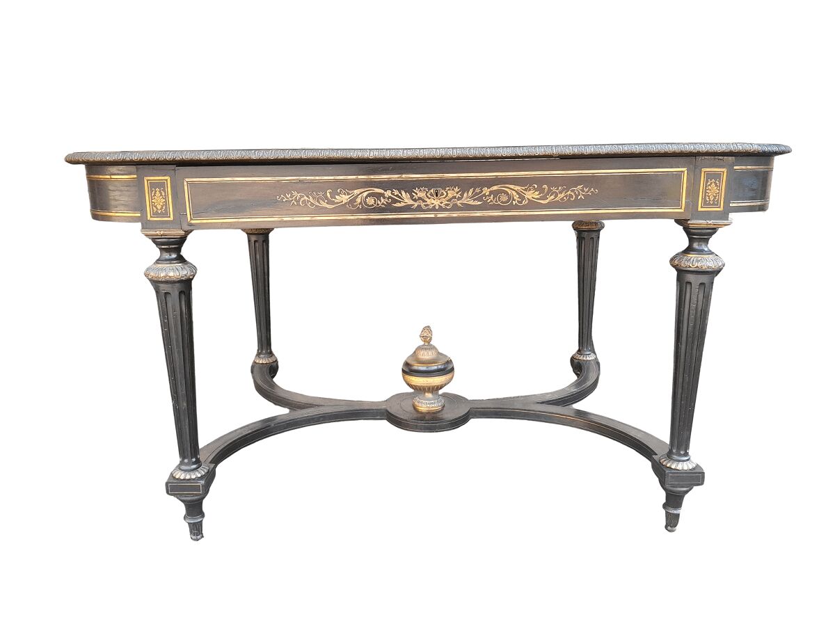 A 19th Century French Ebonised and Brass inlay and Metal Mounted Table with Drawer