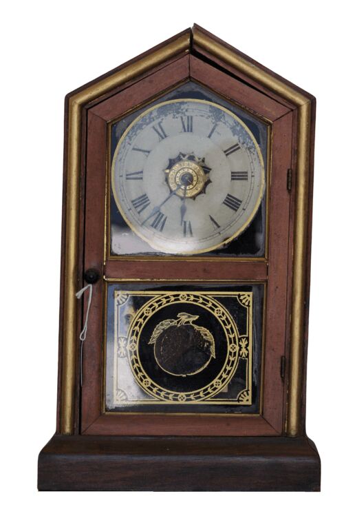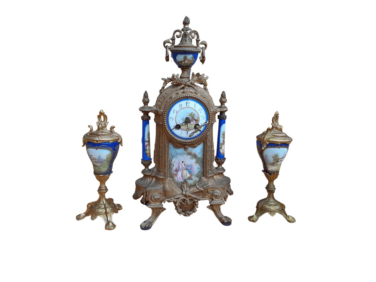 A 19th Century French Garniture Set With Gilt Bonze Clock With Key And Pair Of Gilt Metal Porcelain Garniture On Velvet Bases