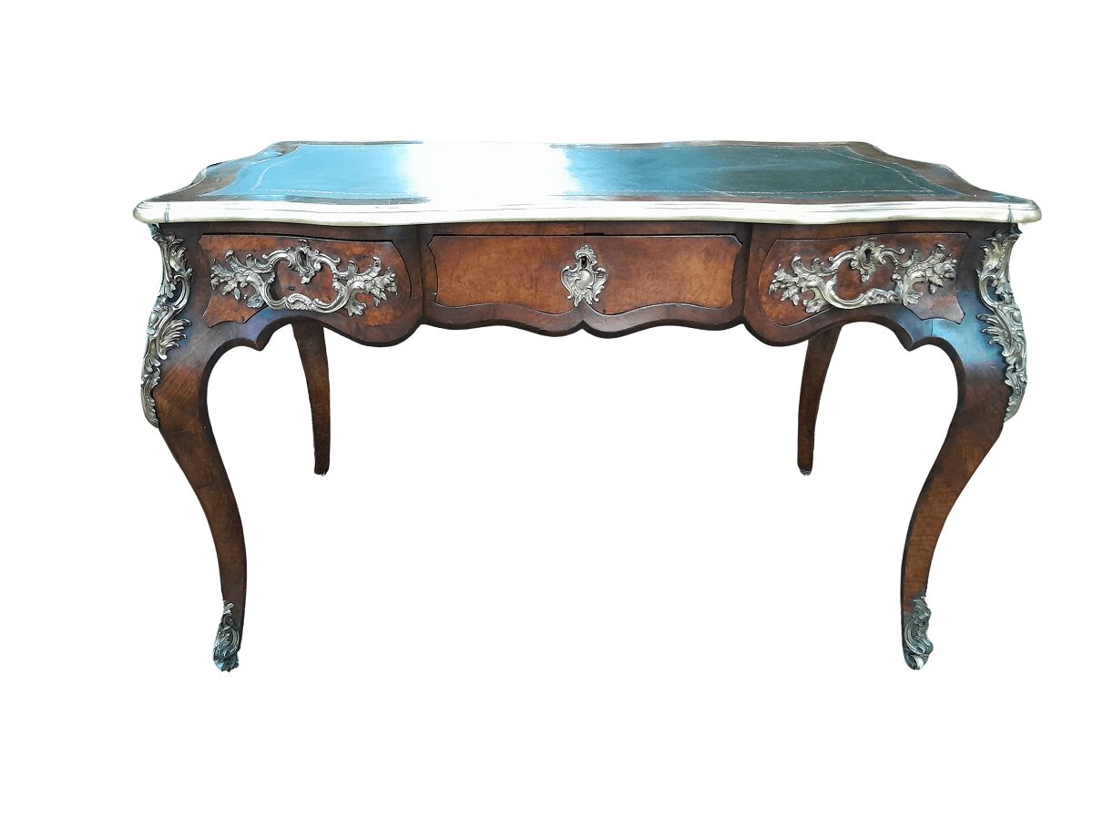 A 19TH Century French Walnut and Ormolu Mounted Desk/Writing Table/Plat with Tilt Tooled Leather Insert and Three Drawers