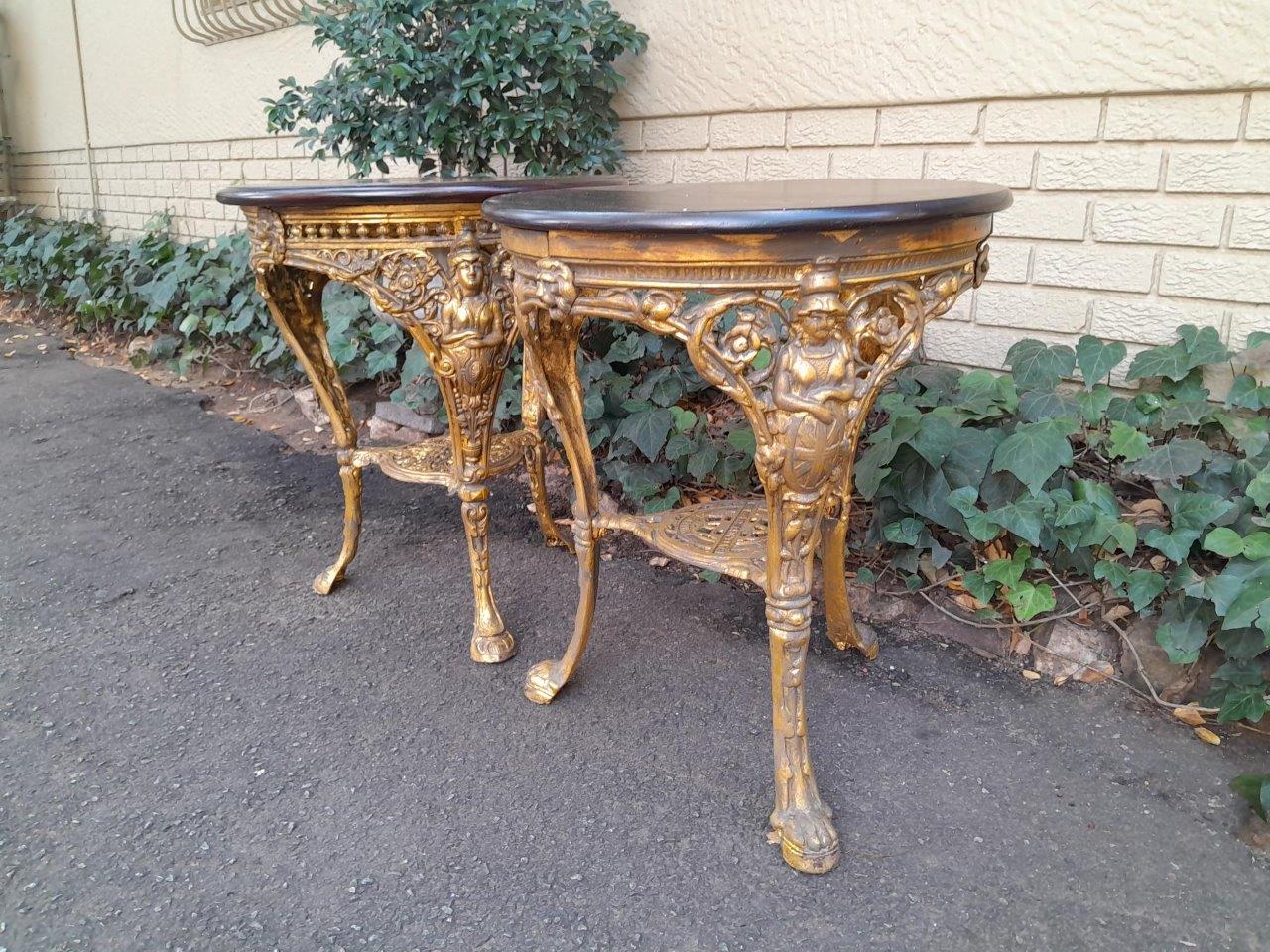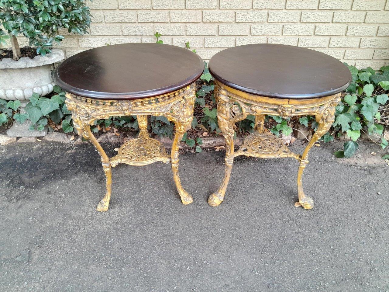 A 19th Century Pair of Original Victorian Britannia  Cast Iron Pub Tables with Teak Wooden Tops In a Contemporary Hand Gilded Finish