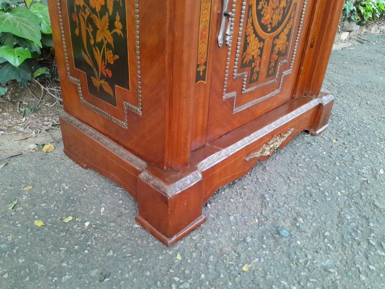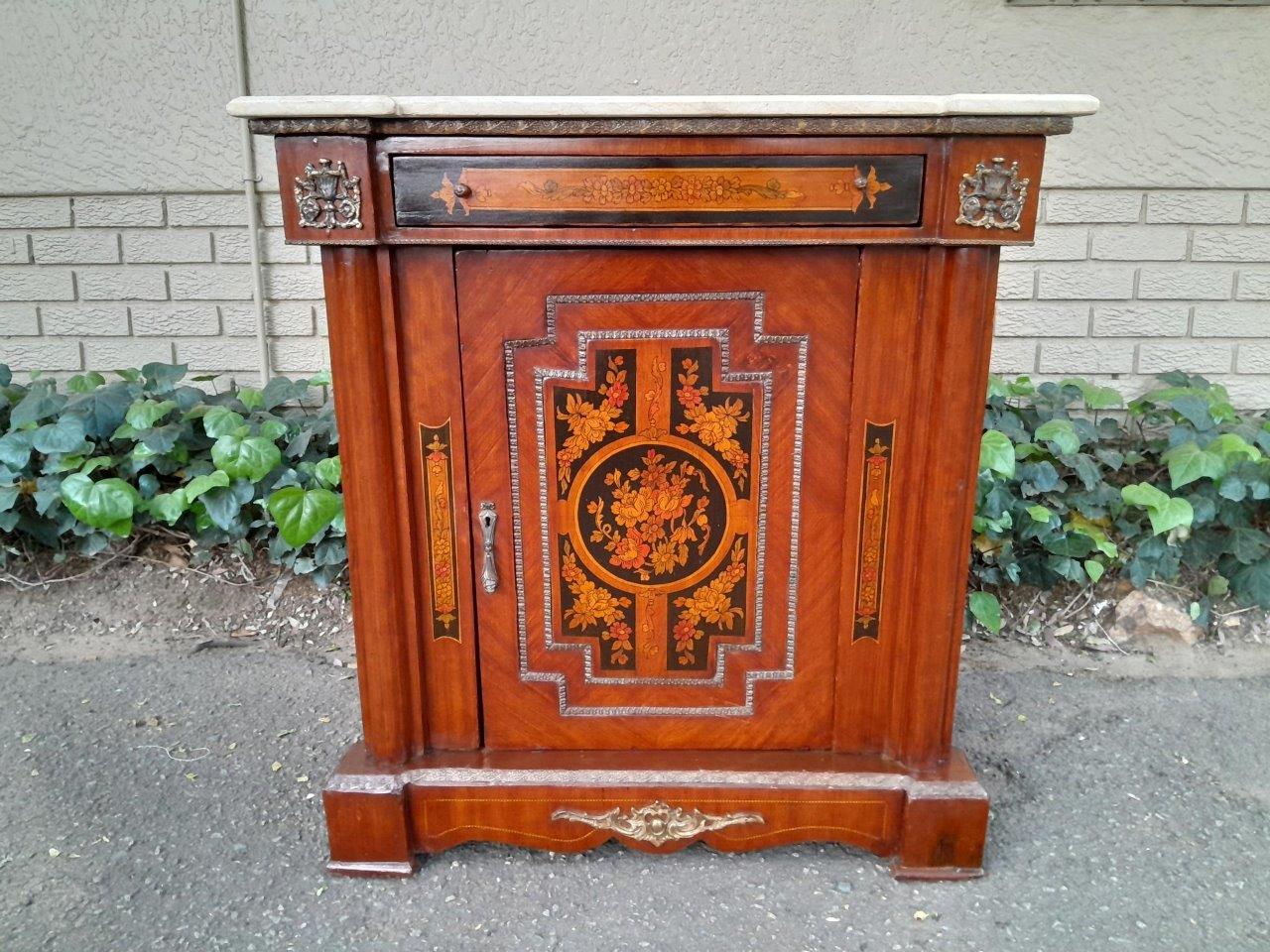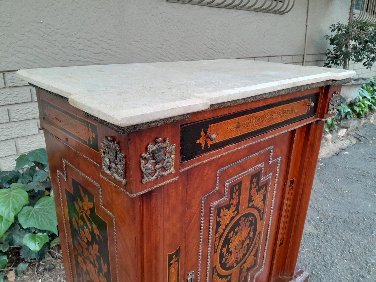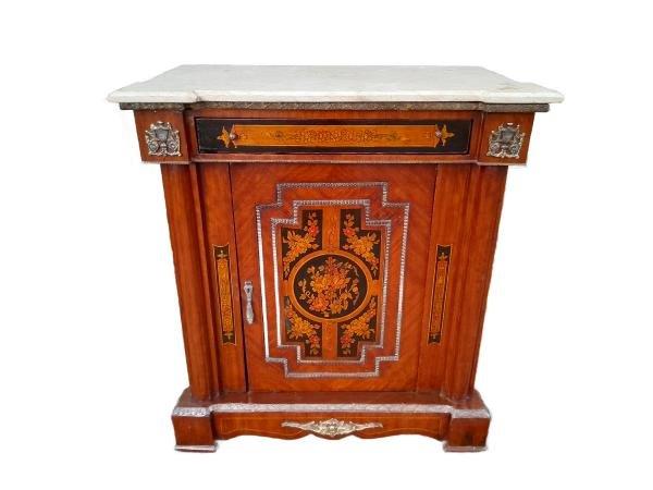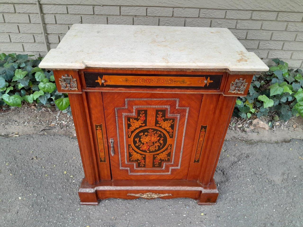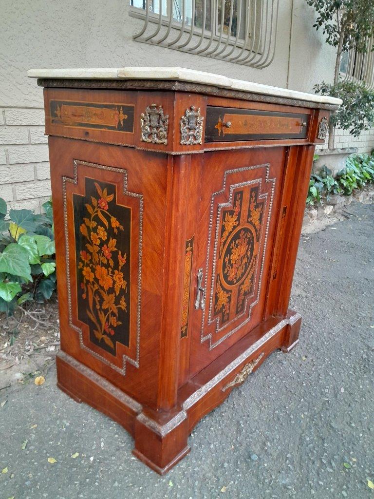A 20th Century Cabinet With Floral Inlay And Ormolu Hardware With Drawer, Door And Marble Top
