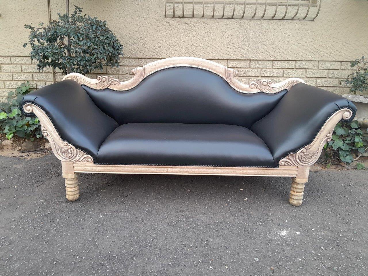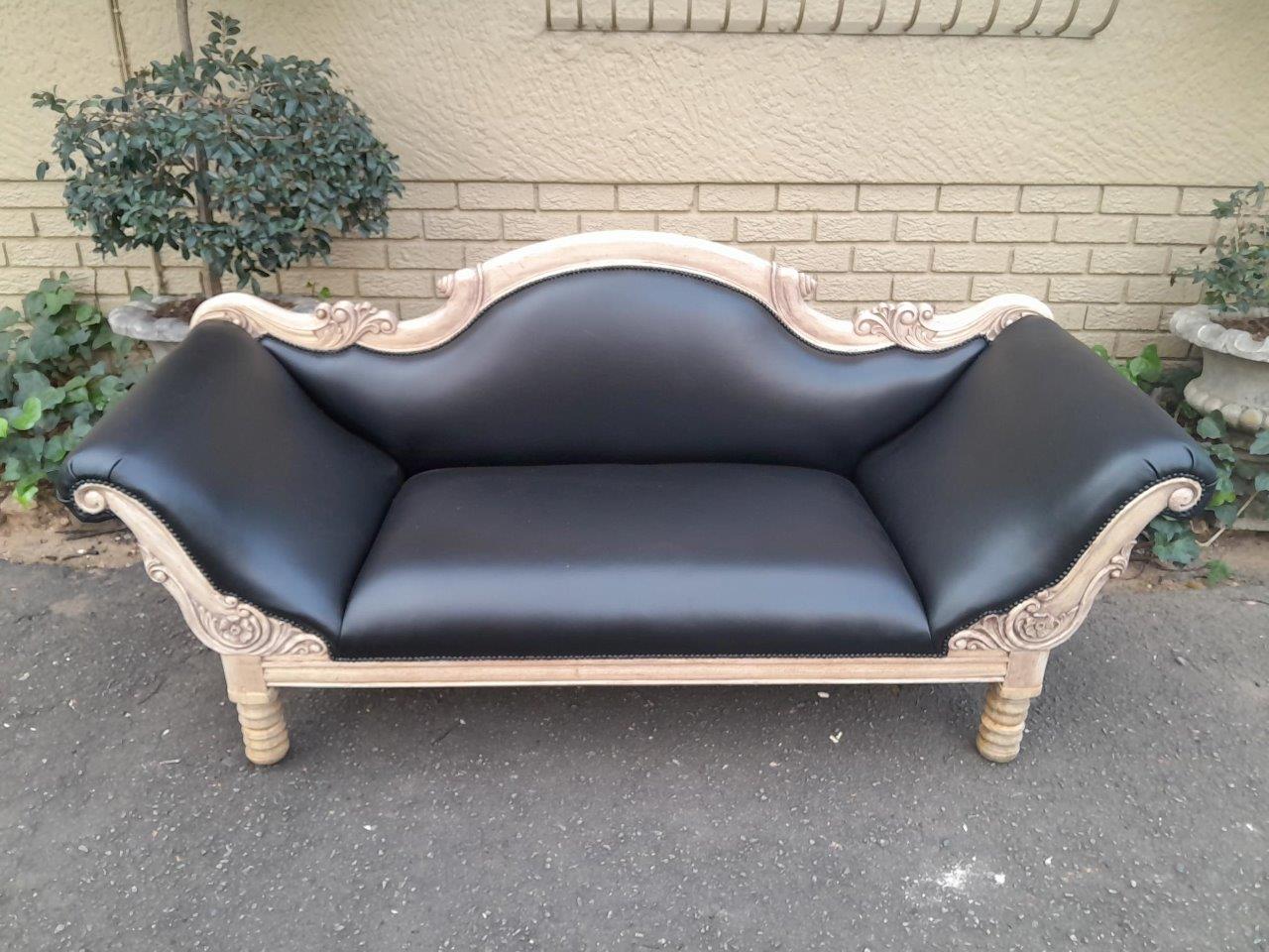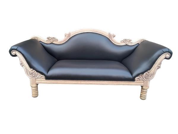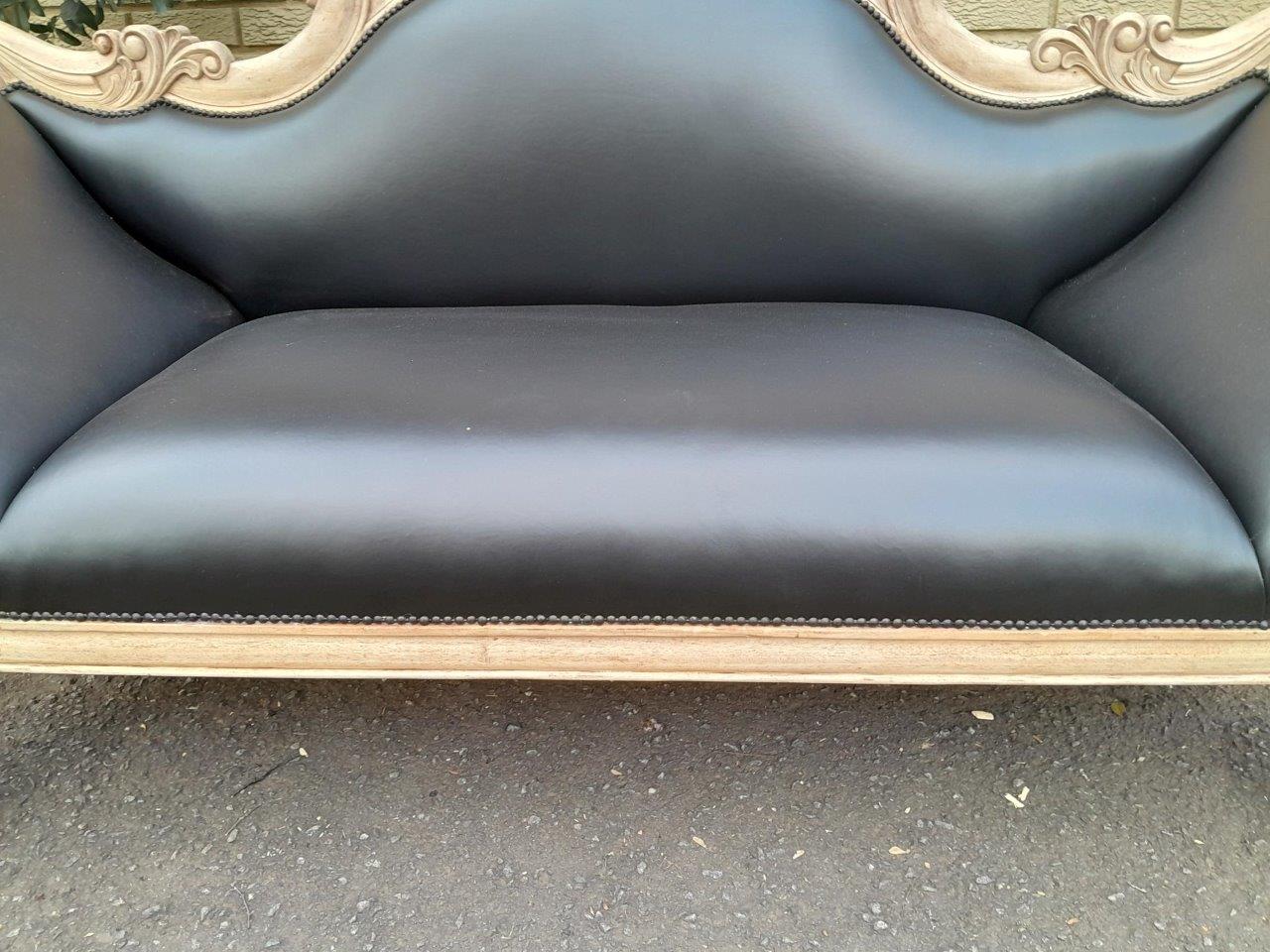 A 20th Century Carved Mahogany Wooden Settee With Brass Castors, Upholstered In Leather In A Bleached Contemporary Finish