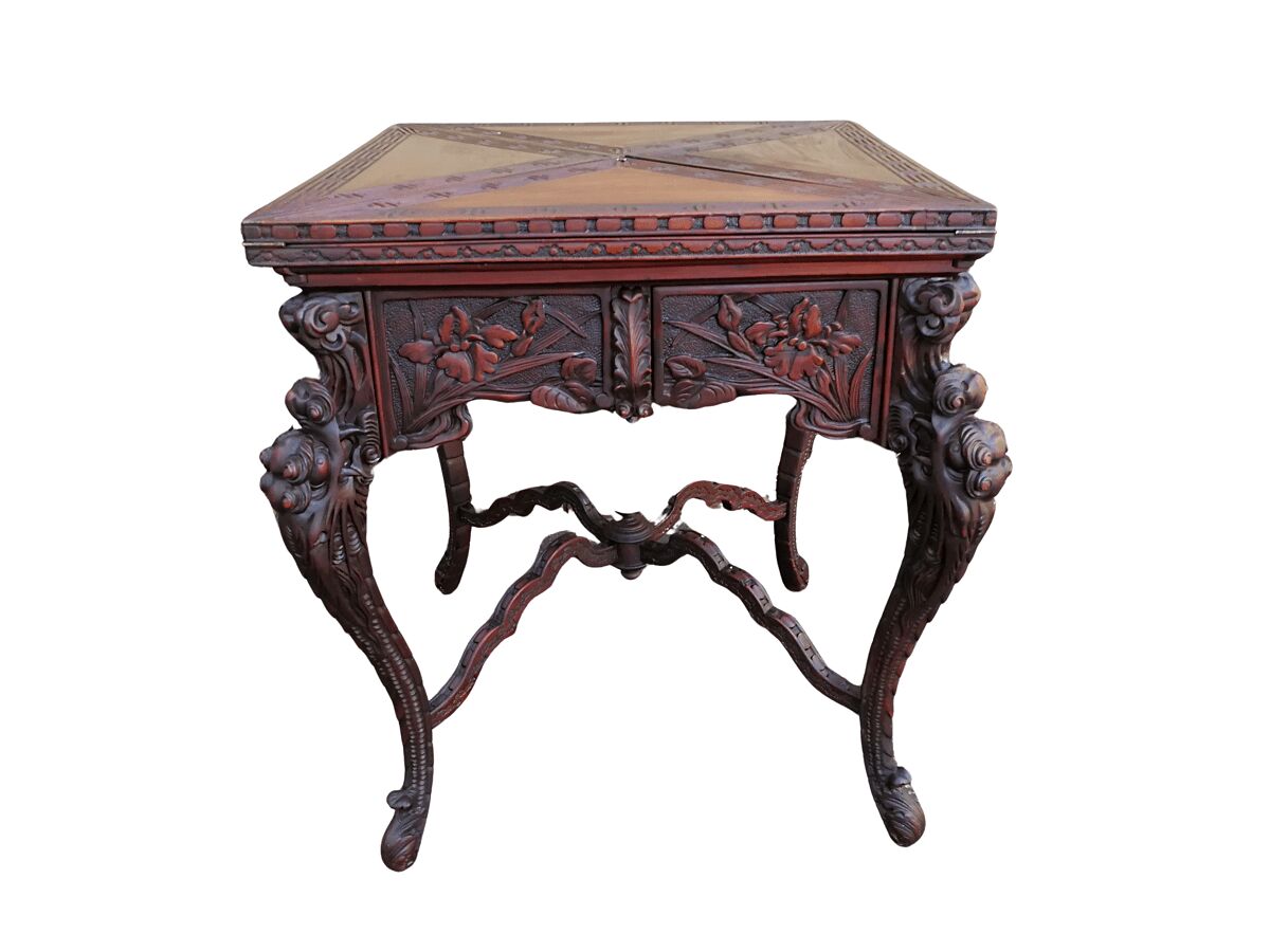 A 20th Century Carved Wooden Games Table with Four Drawers and Interior with Baize and Four Drawers