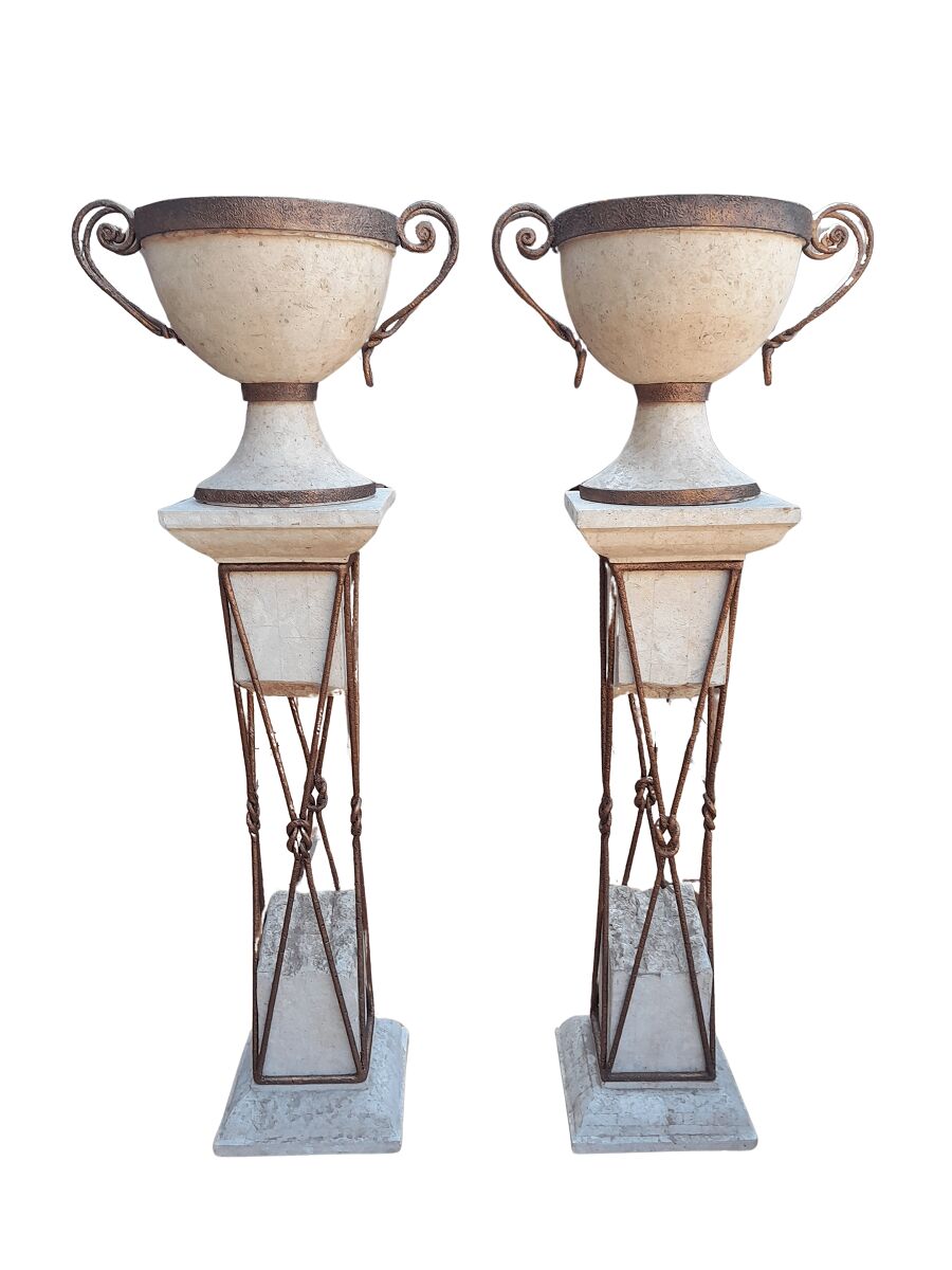 A 20th Century Decorative Pair Of Metal And Stone Urns On Stands