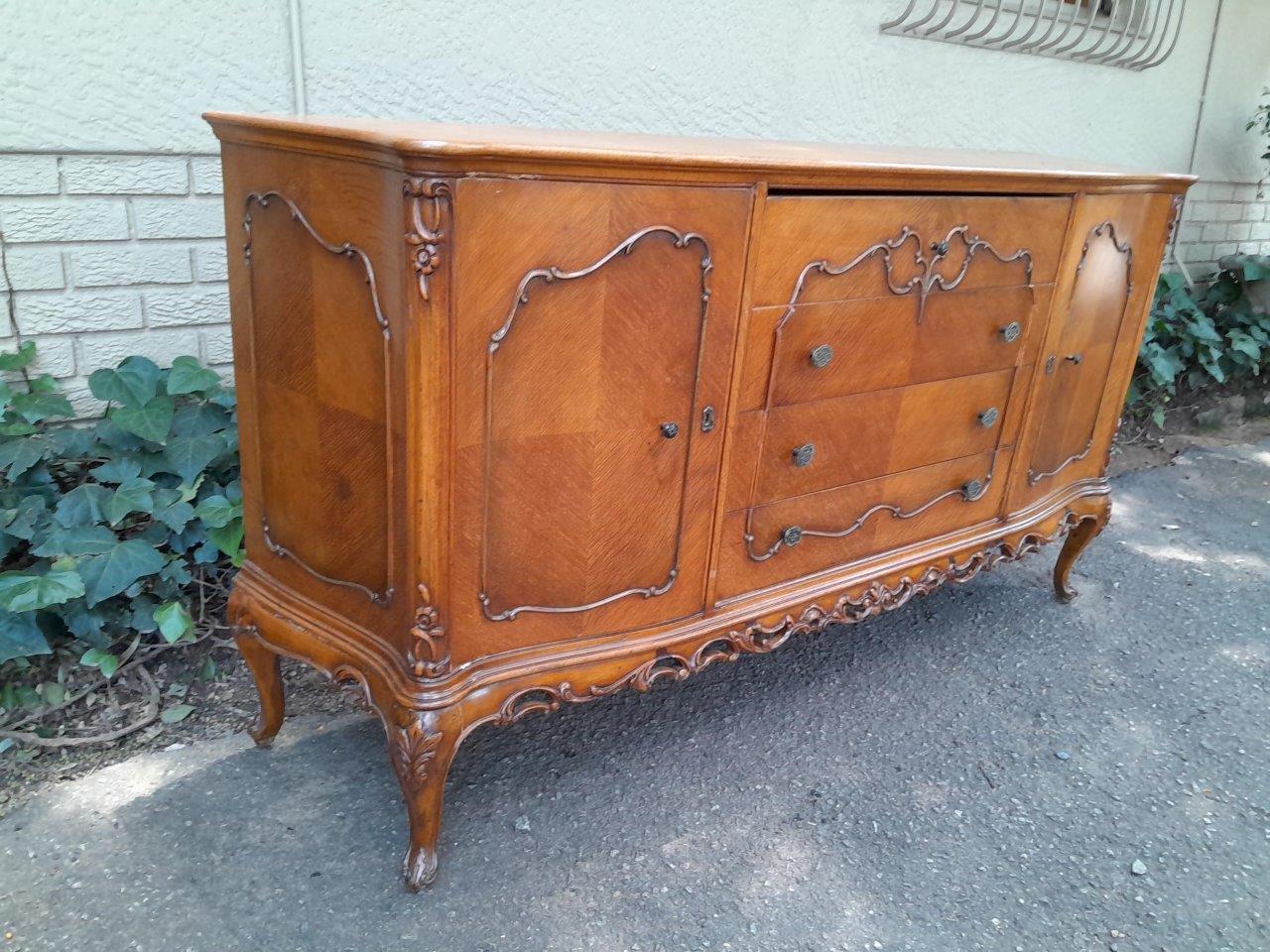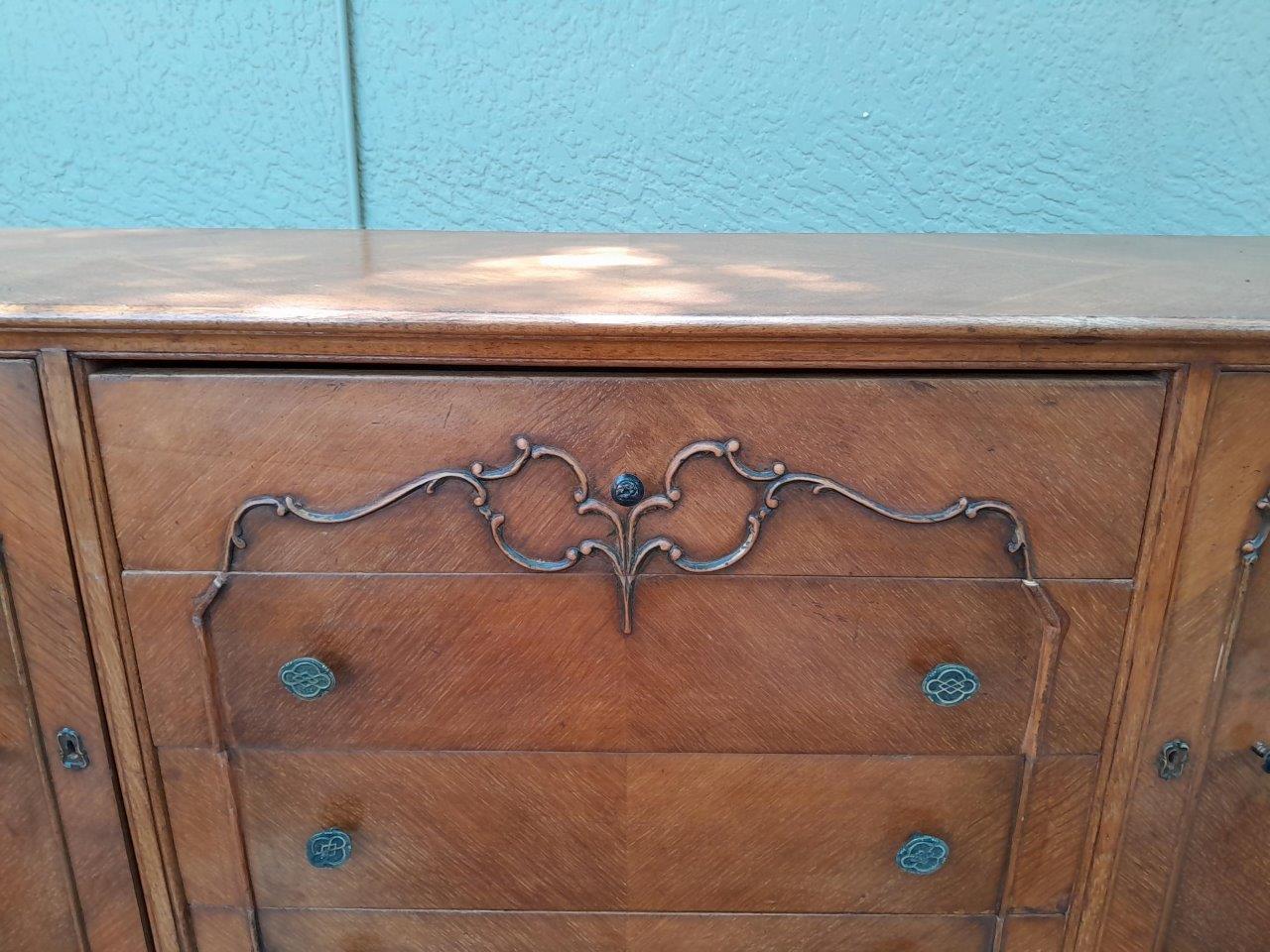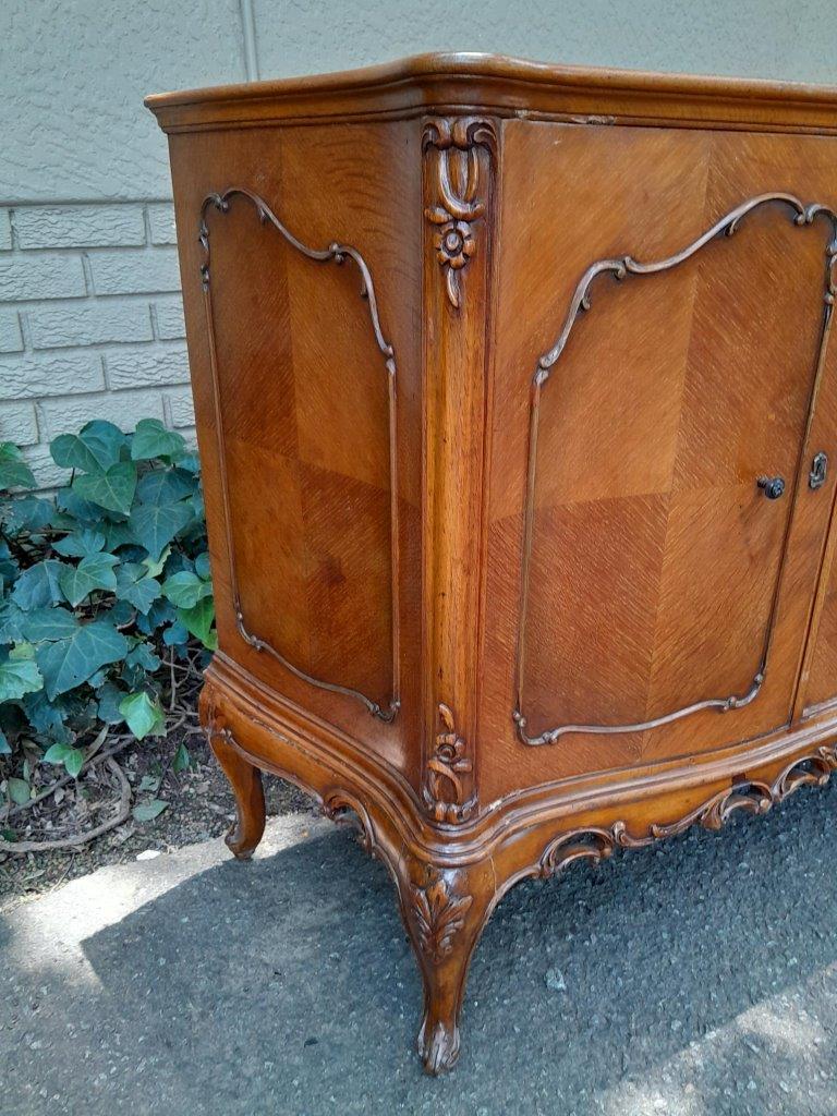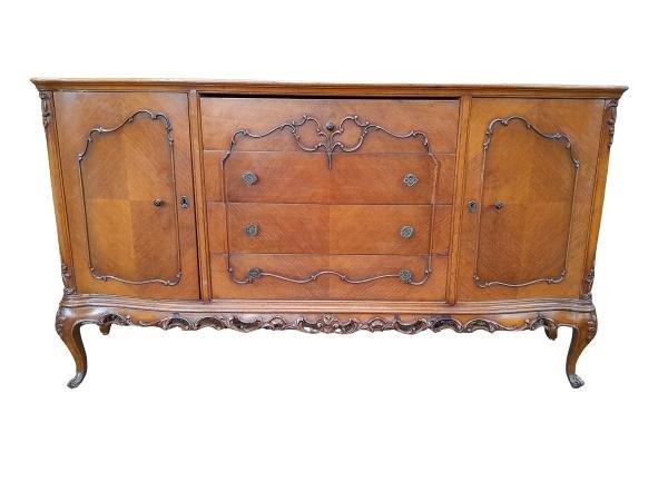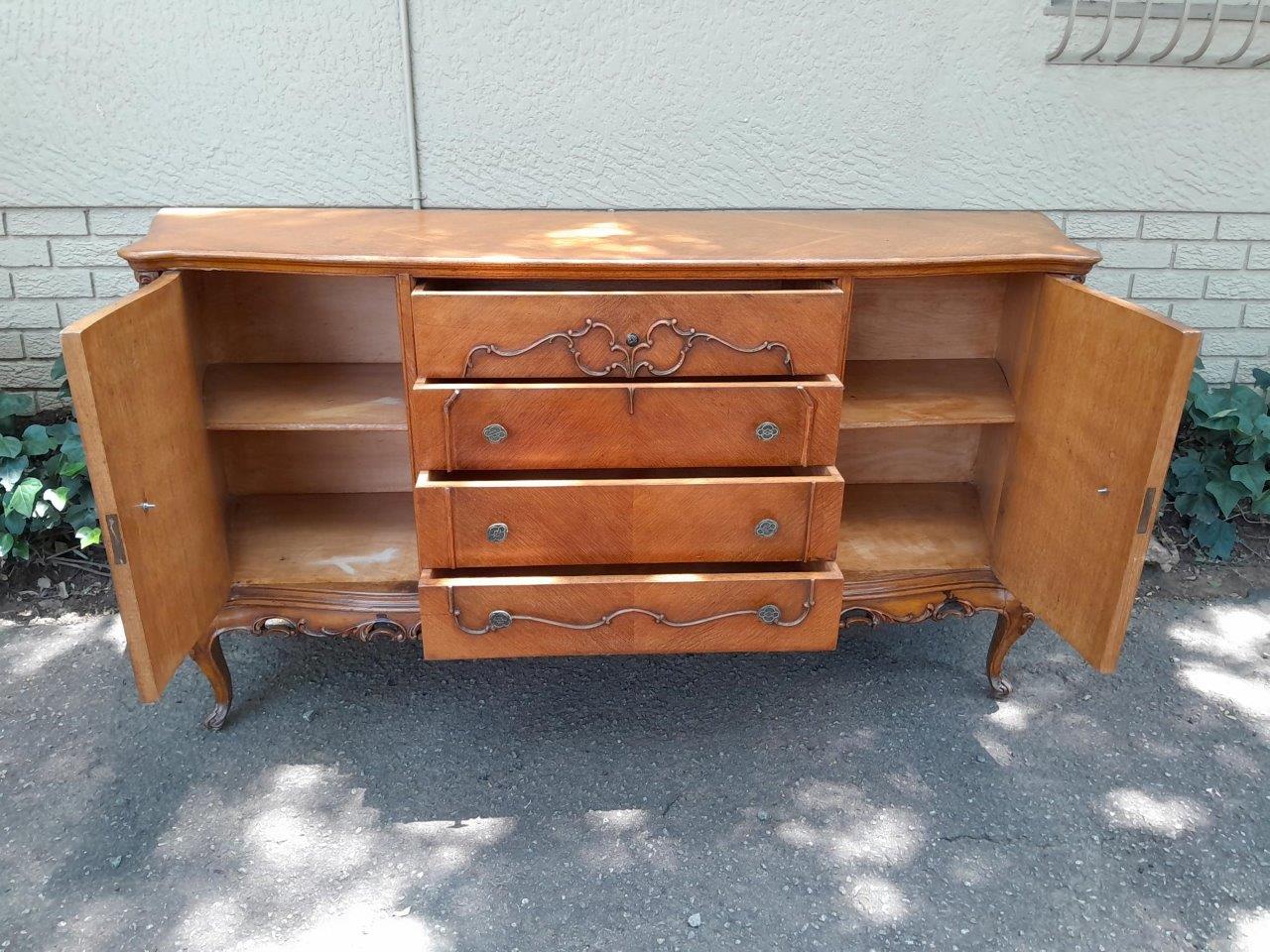 A 20th Century French Provincial Louis XV Style Walnut Sideboard with Four Drawers and Two Doors with Shelves With A Cream Marble Top In A Contemporary Bleached Finish