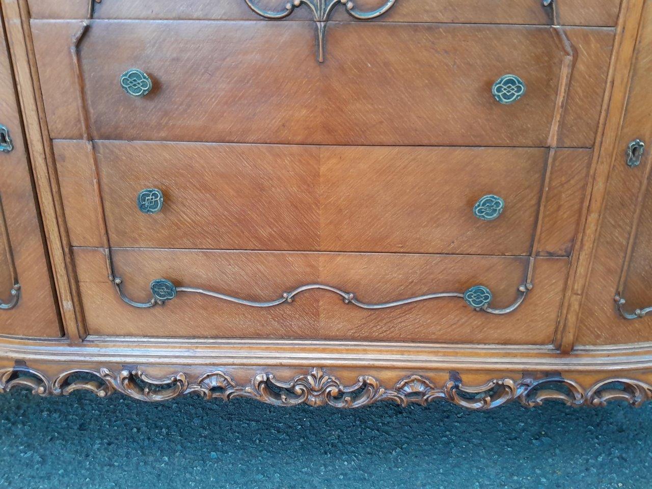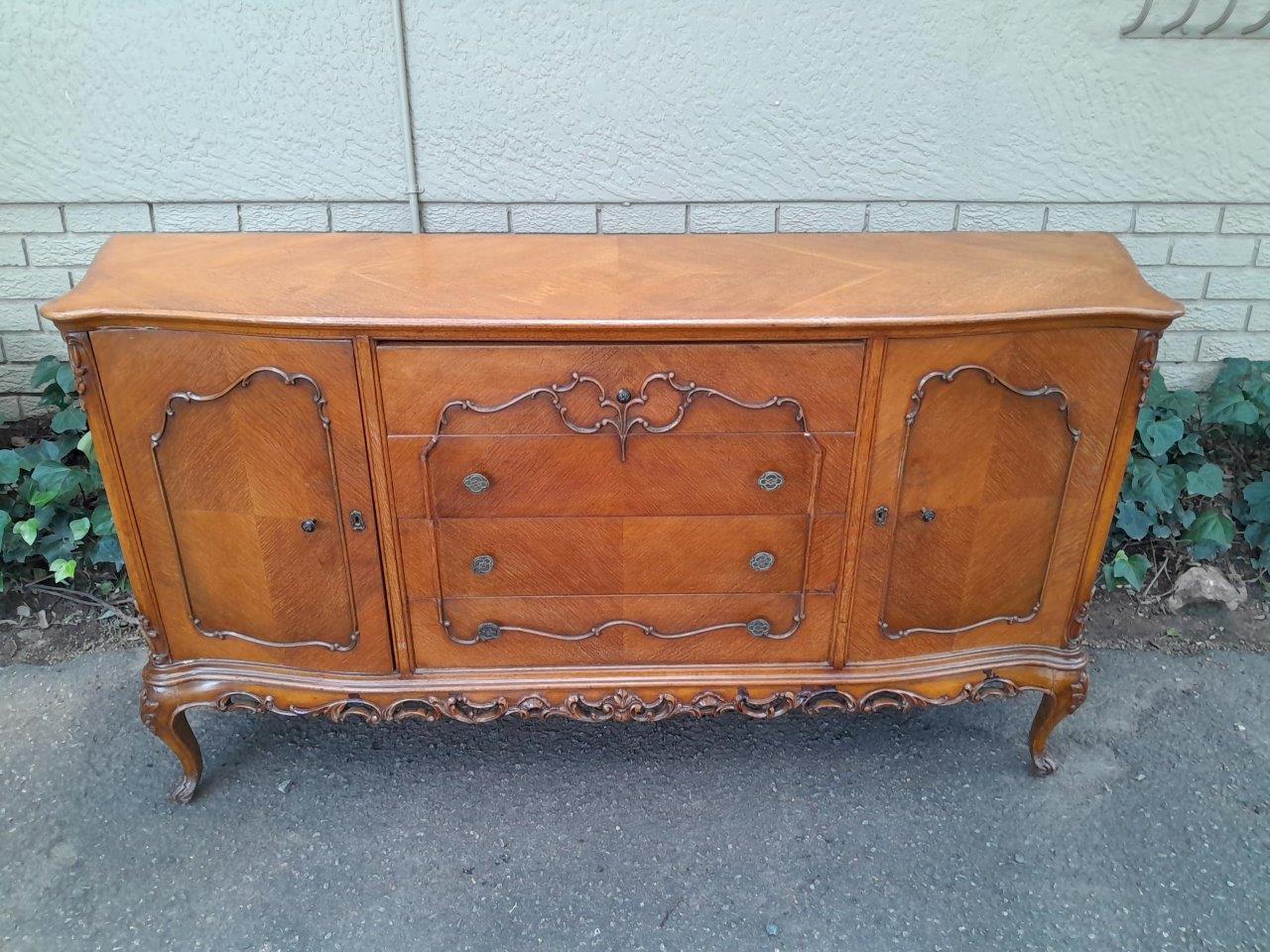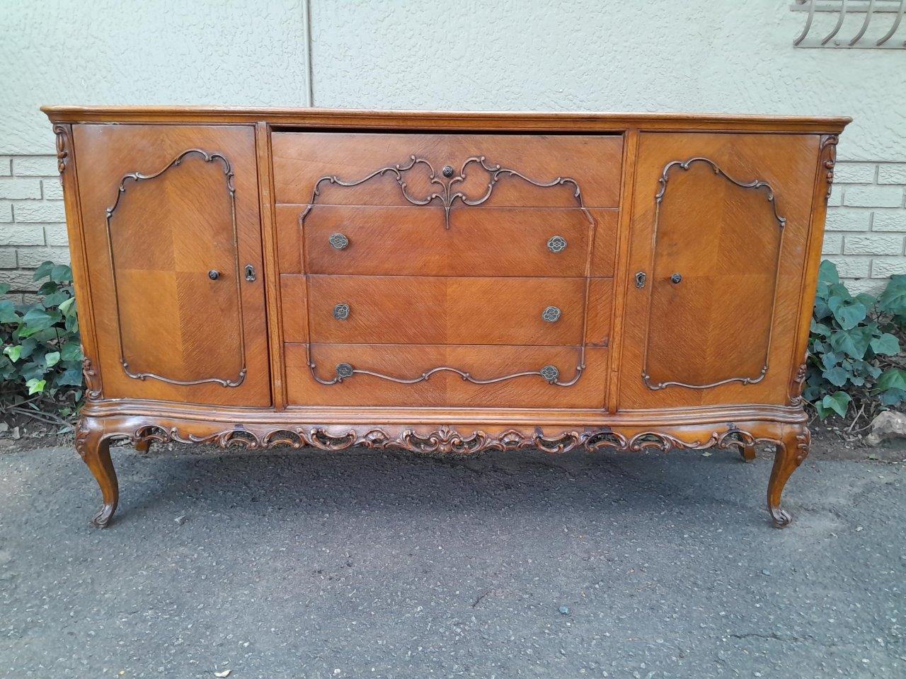 A 20th Century French Provincial Louis XV Style Walnut Sideboard with Four Drawers and Two Doors with Shelves With A Cream Marble Top In A Contemporary Bleached Finish