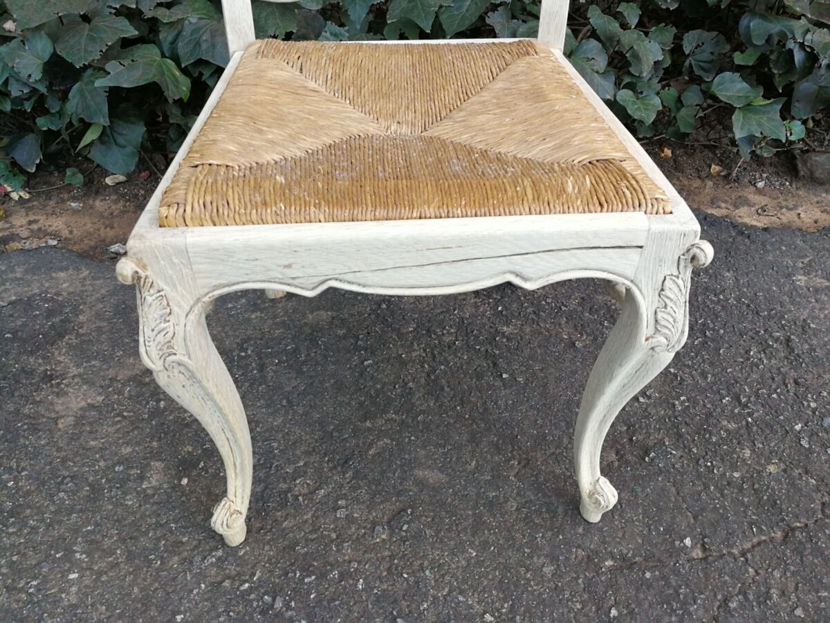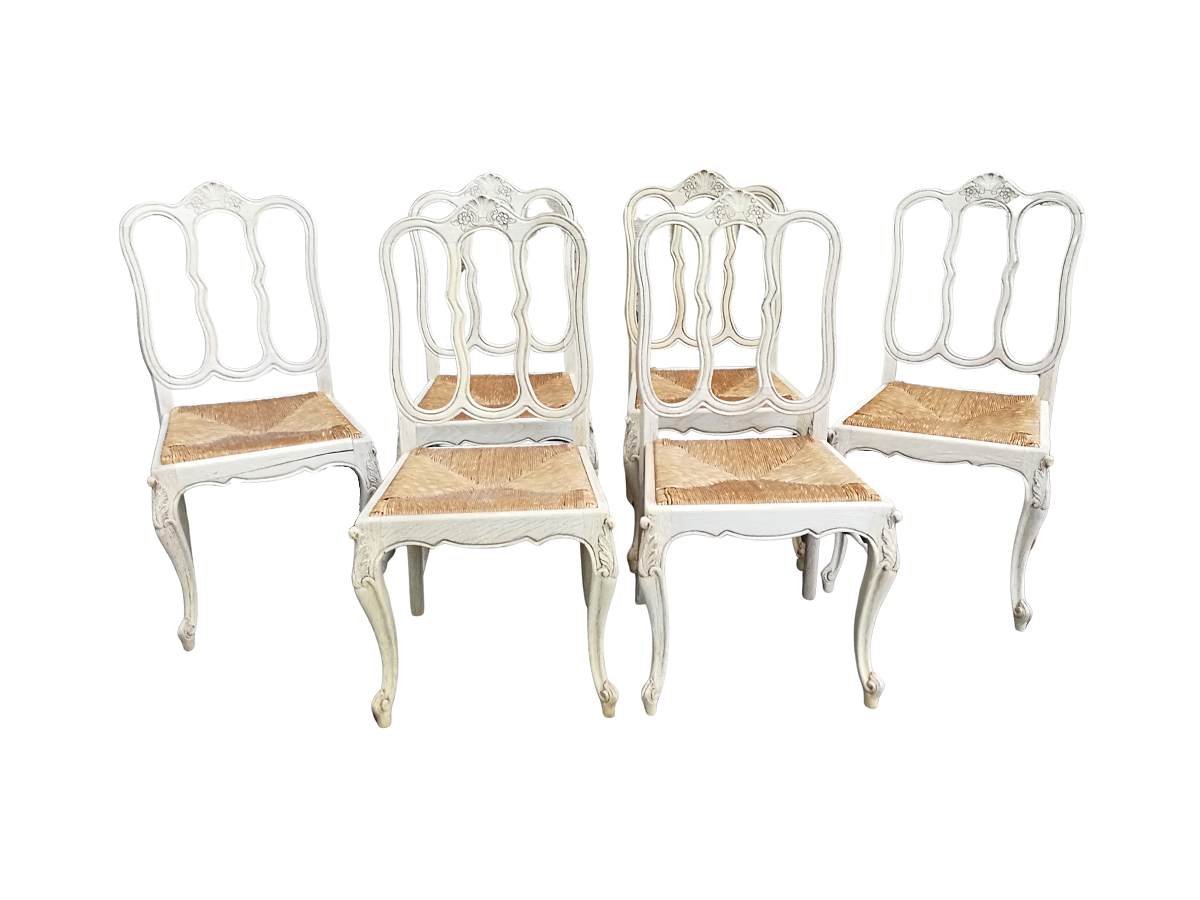 A 20TH Century French Set of Six Carved Dining Chairs with Rush Seats in a Contemporary Bleached Finish