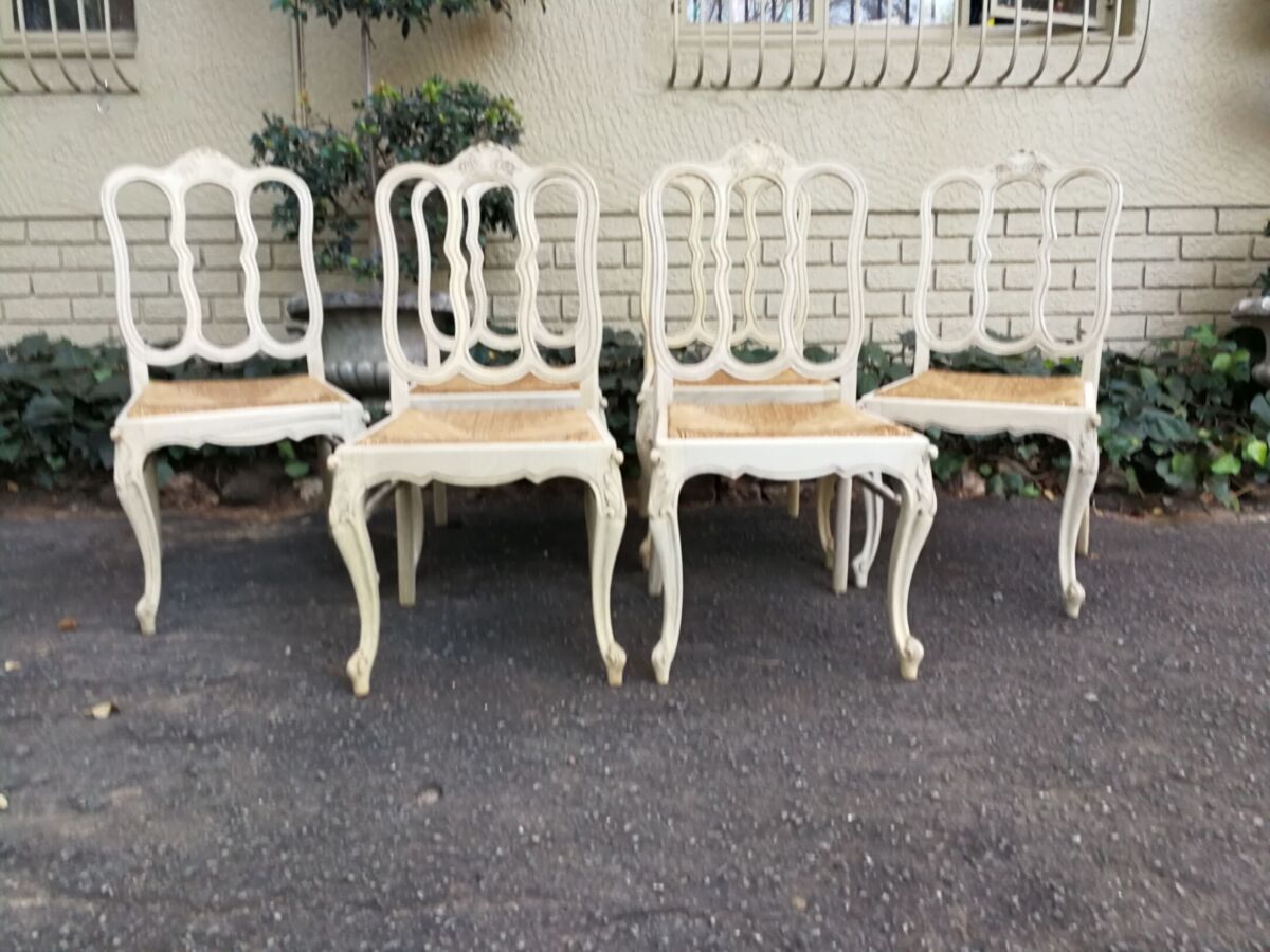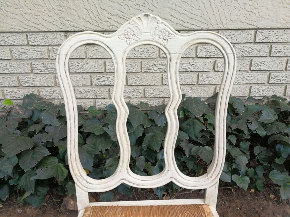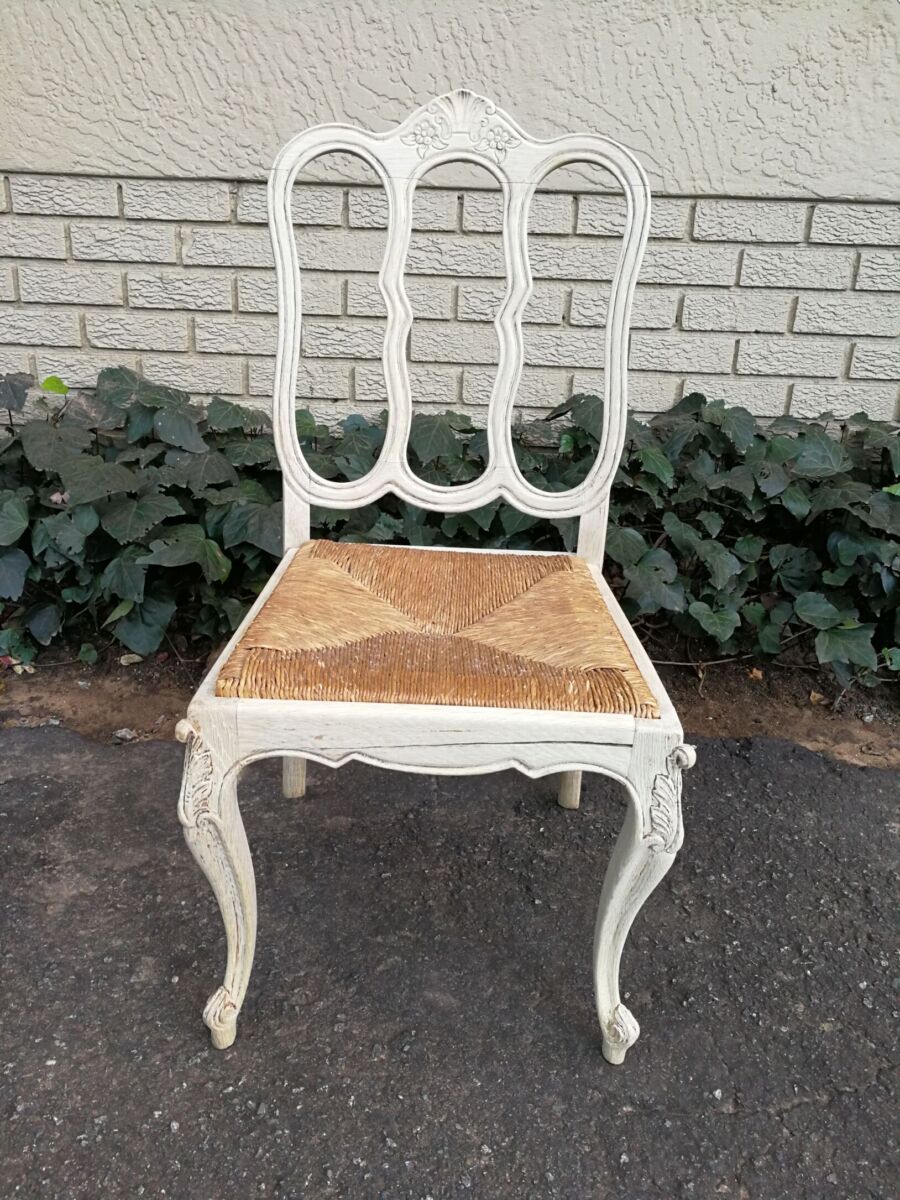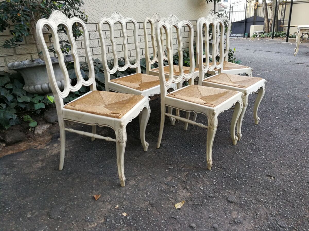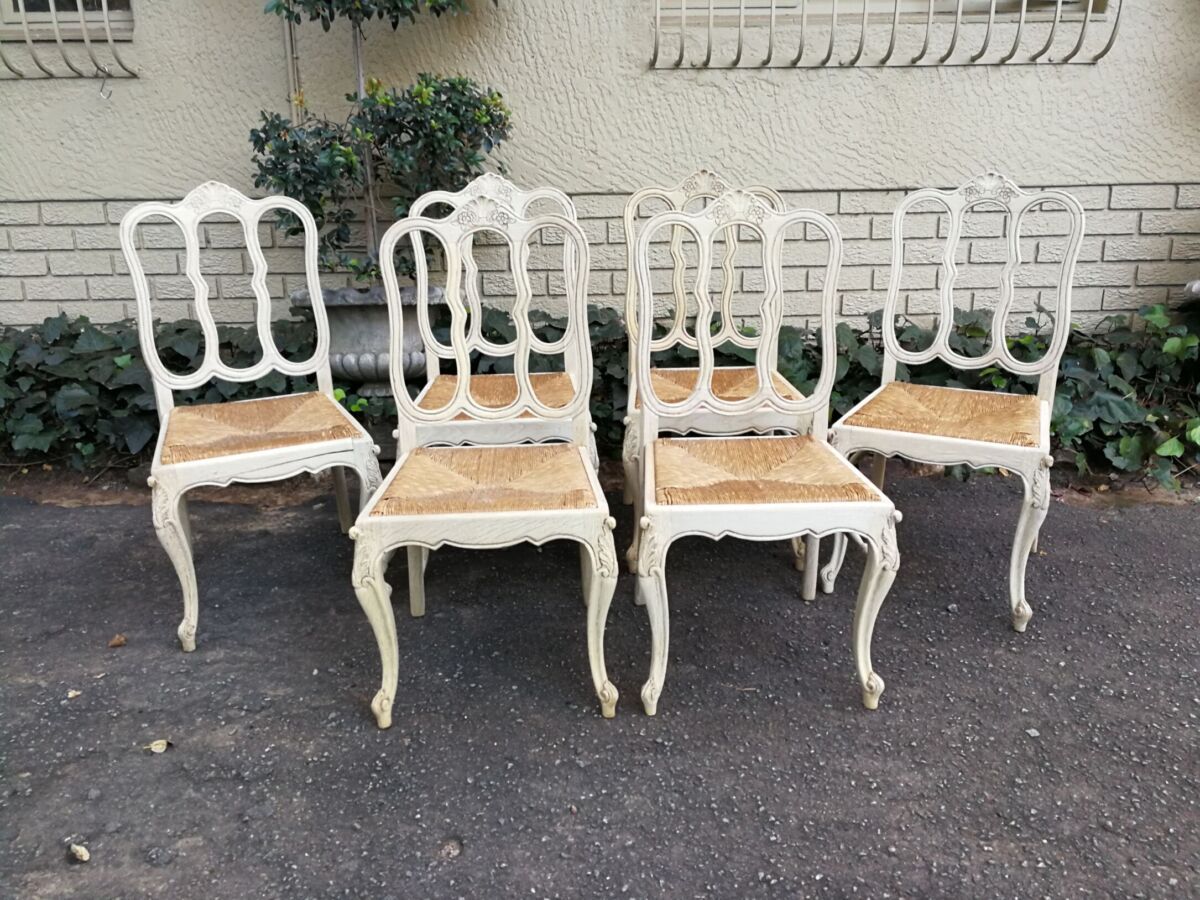 A 20TH Century French Set of Six Carved Dining Chairs with Rush Seats in a Contemporary Bleached Finish  (We can source fabric and upholster seat cushions if required in a quick turnaround time)