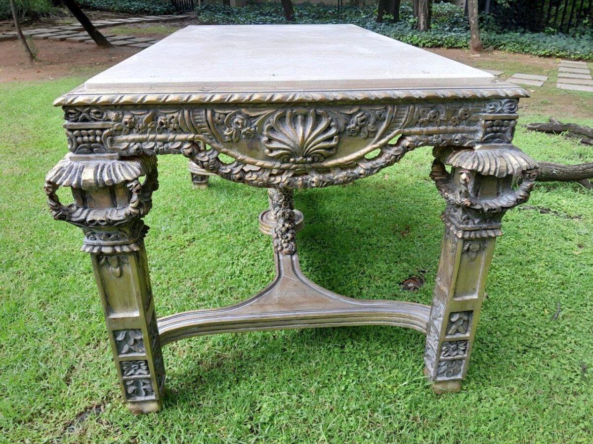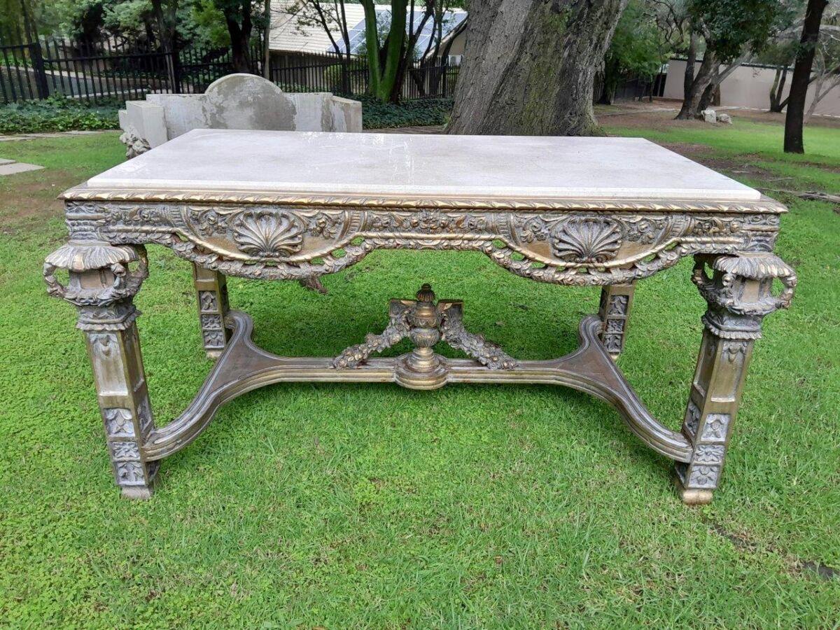 A 20th Century French Style Ornately Carved and Gilded Entrance / Console / Drinks Table with Cream Marble Top