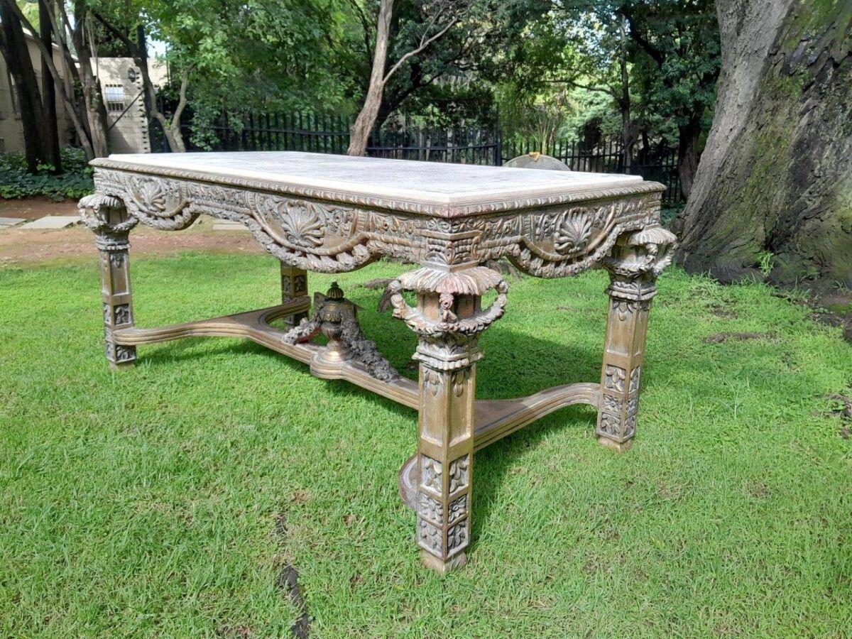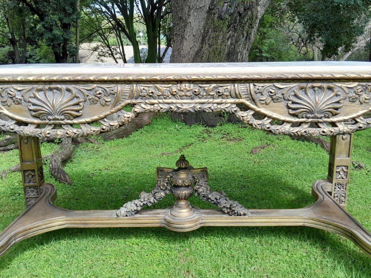 A 20th Century French Style Ornately Carved and Gilded Entrance / Console / Drinks Table with Cream Marble Top