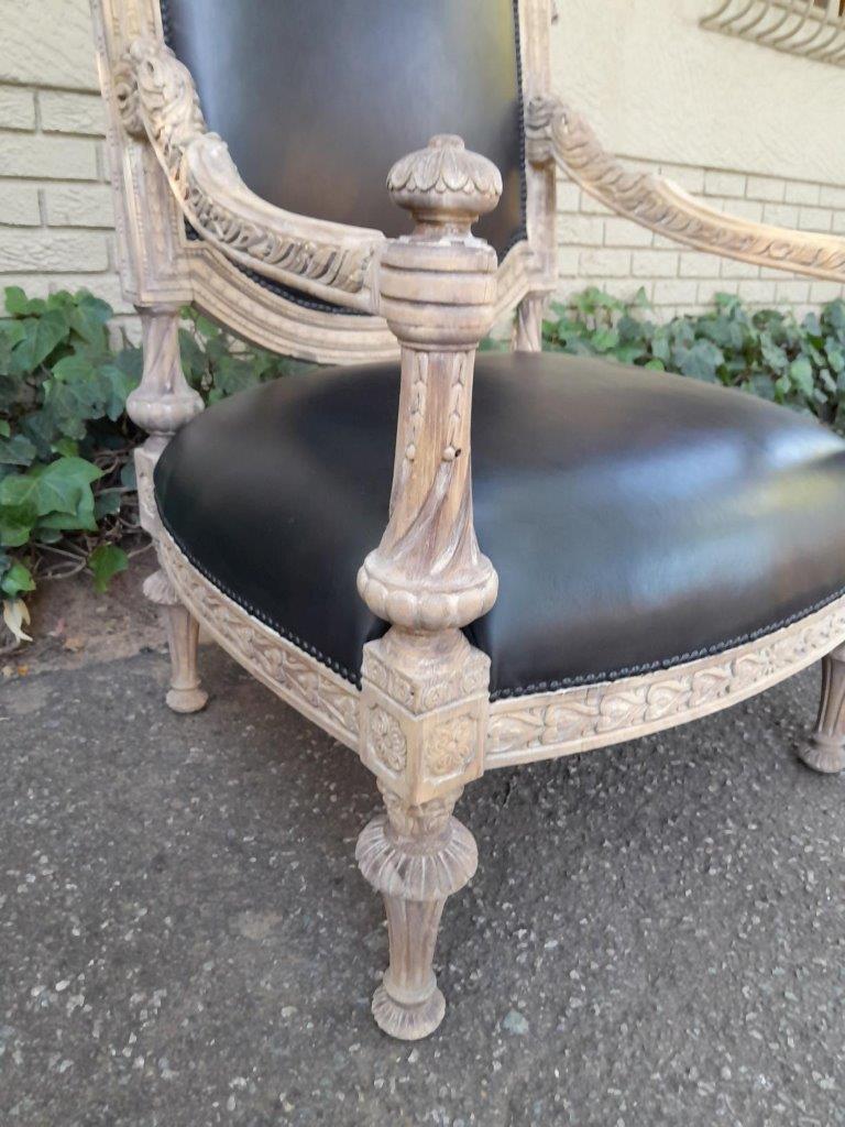 A 20TH Century French Style Ornately Carved Pair of Oak Armchairs in a Contemporary Bleached Finish and Upholstered In Leather