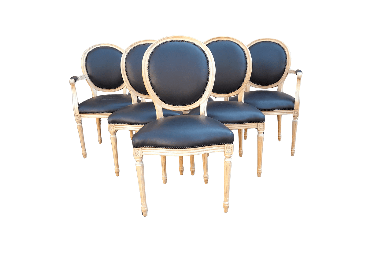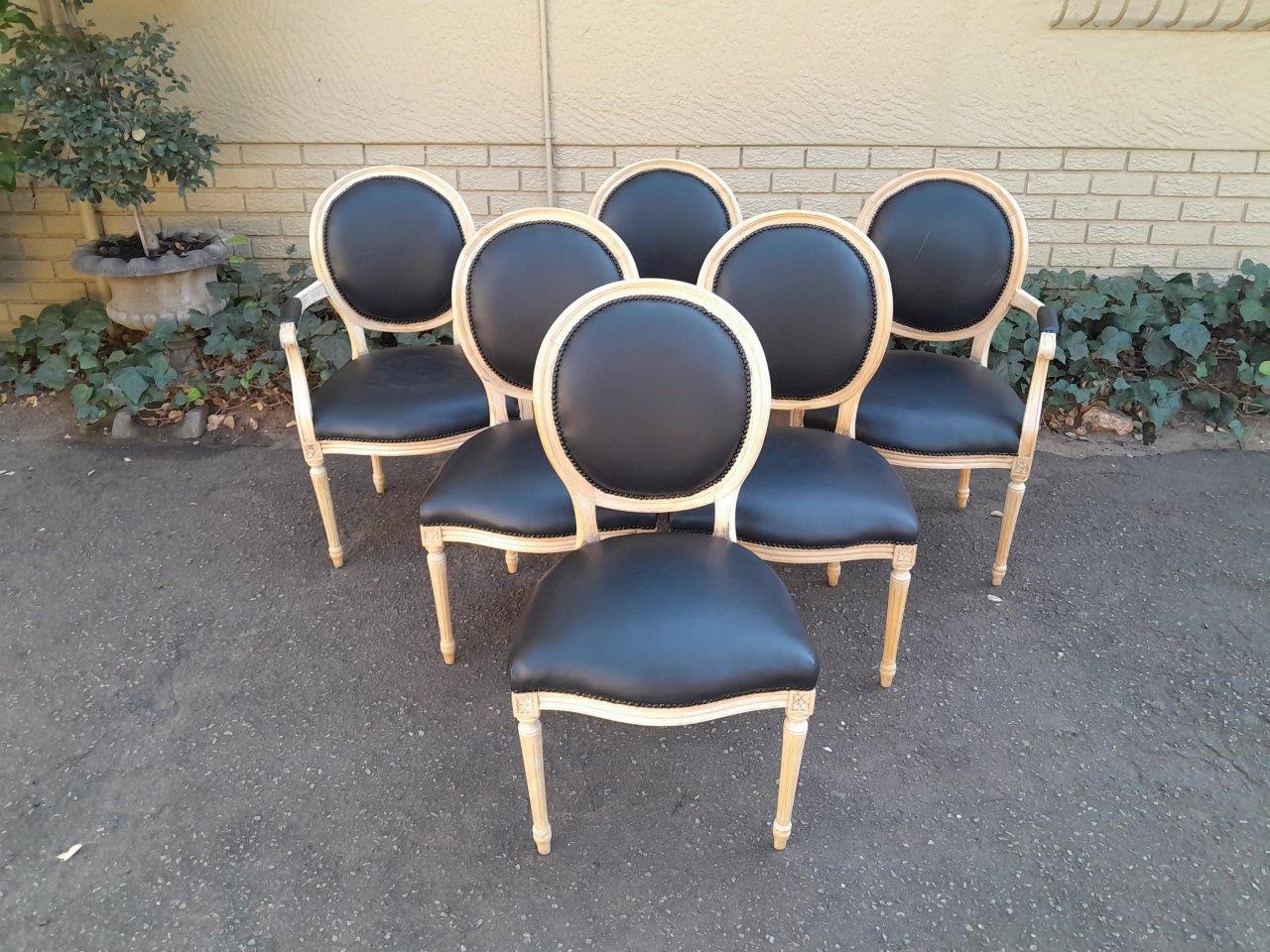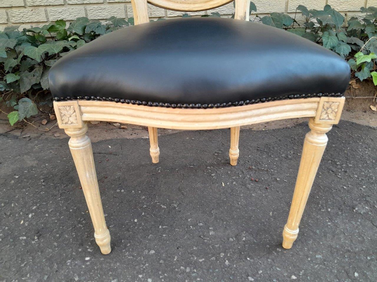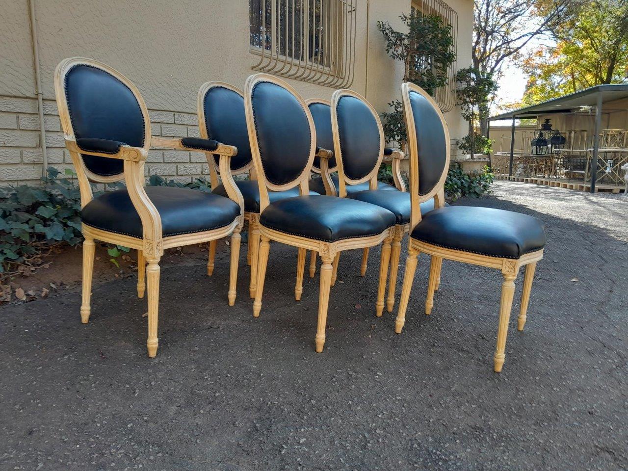 A 20th Century French Style Set of Six (6) Chairs Comprising a Pair of Carvers / Arm Chairs and Four Dining ChairsĀ in a Contemporary Bleached Finish and Upholstered in Leather
