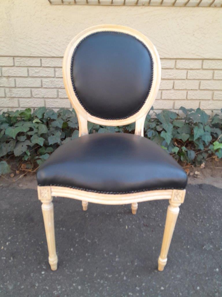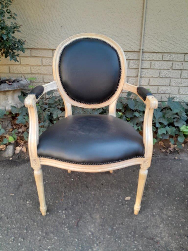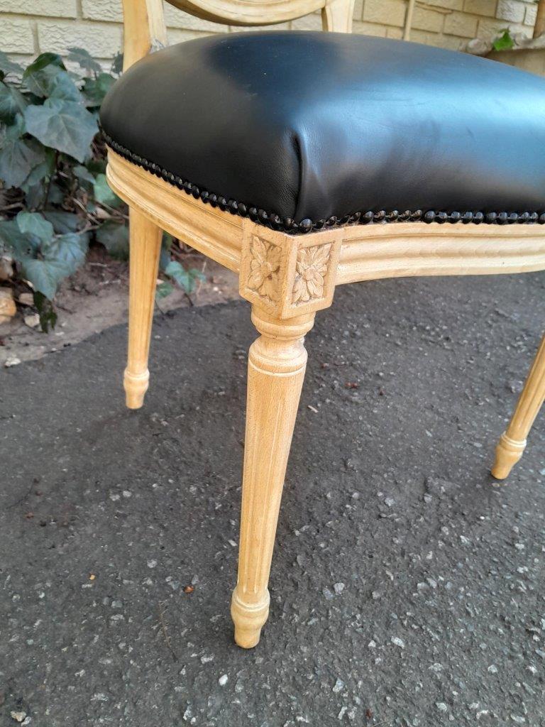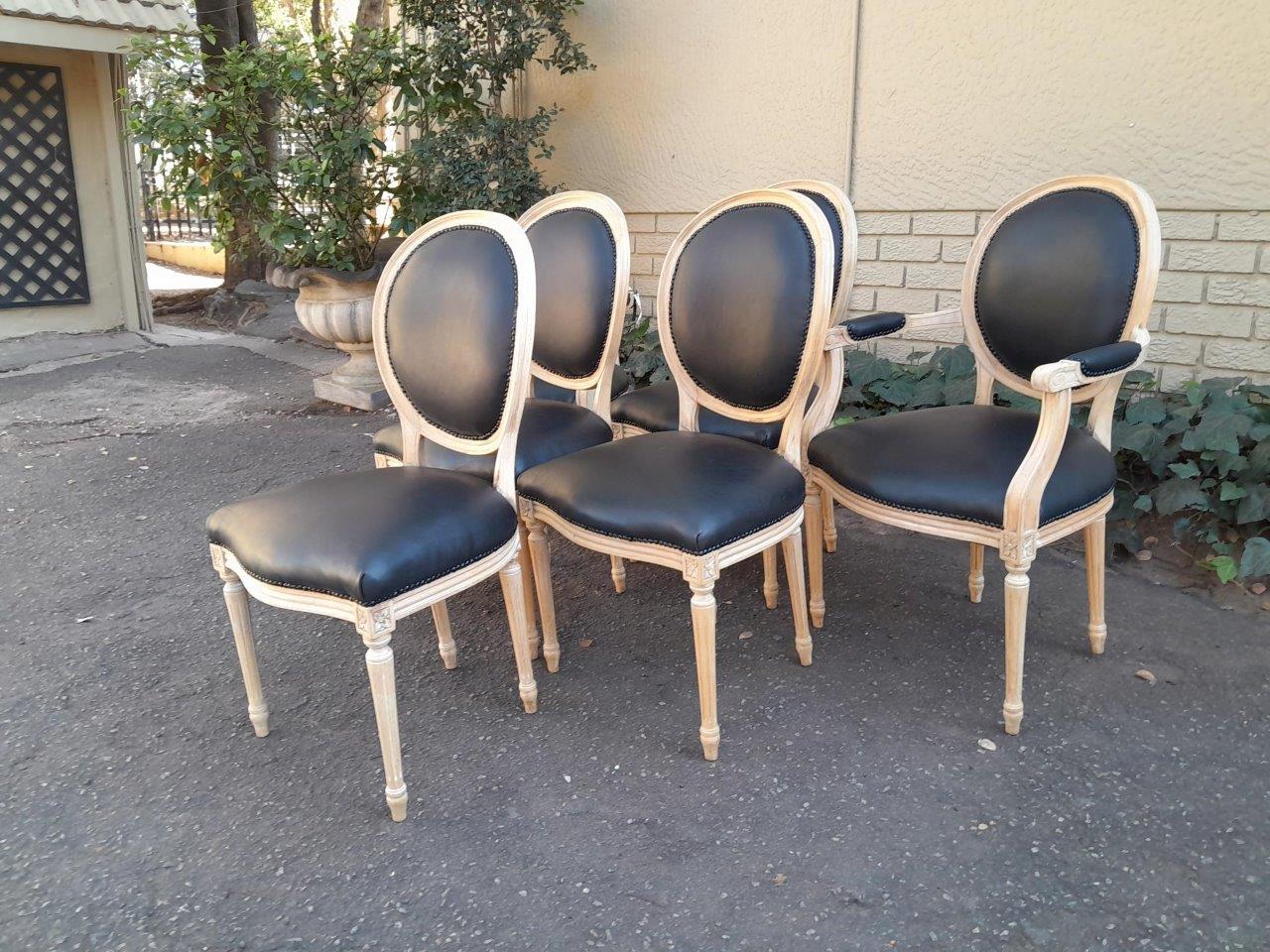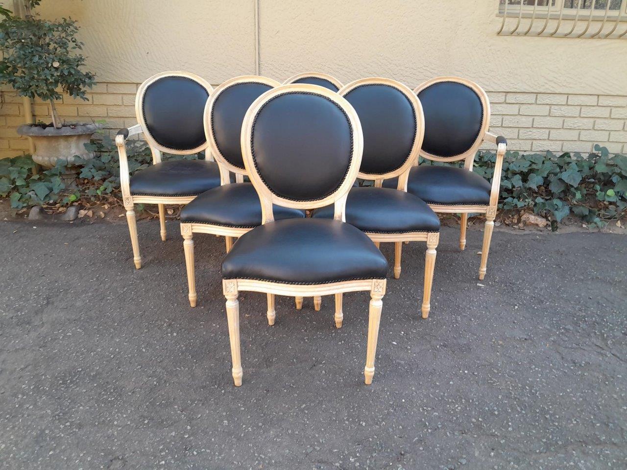 A 20th Century French Style Set of Six (6) Chairs Comprising a Pair of Carvers / Arm Chairs and Four Dining ChairsĀ in a Contemporary Bleached Finish and Upholstered in Leather