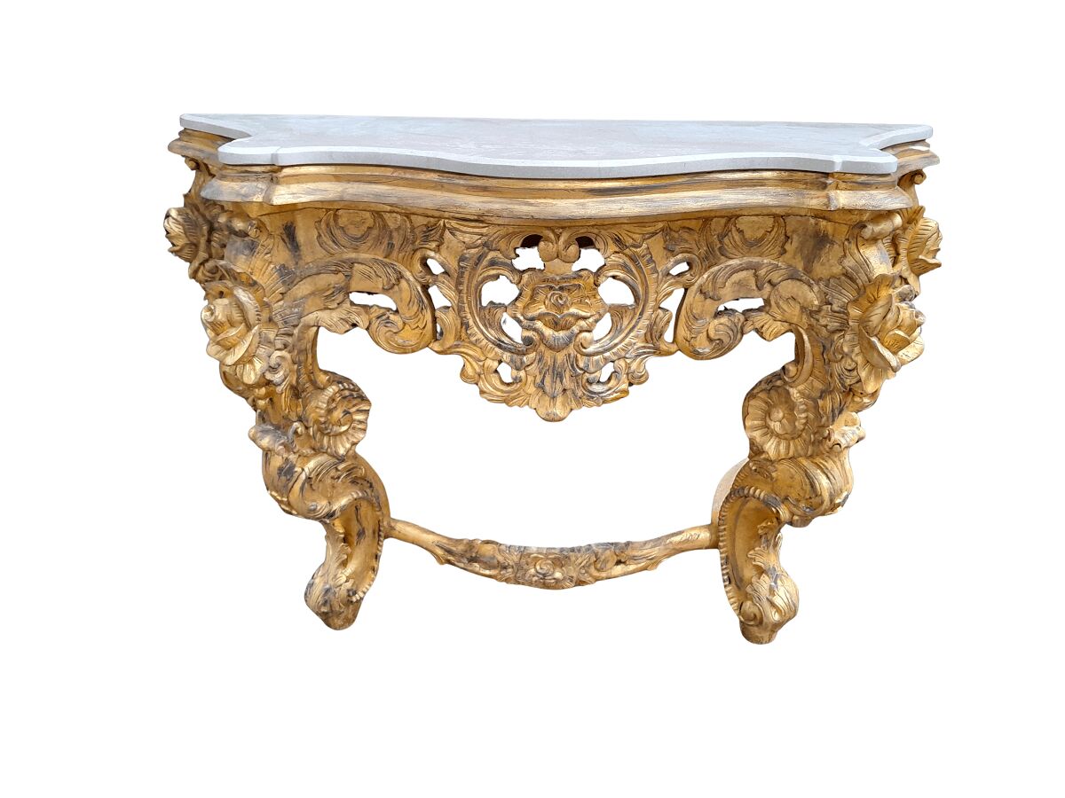 A 20th Century Heavily Carved and Hand Gilded with Gold Leaf Console Table with Cream Marble Top