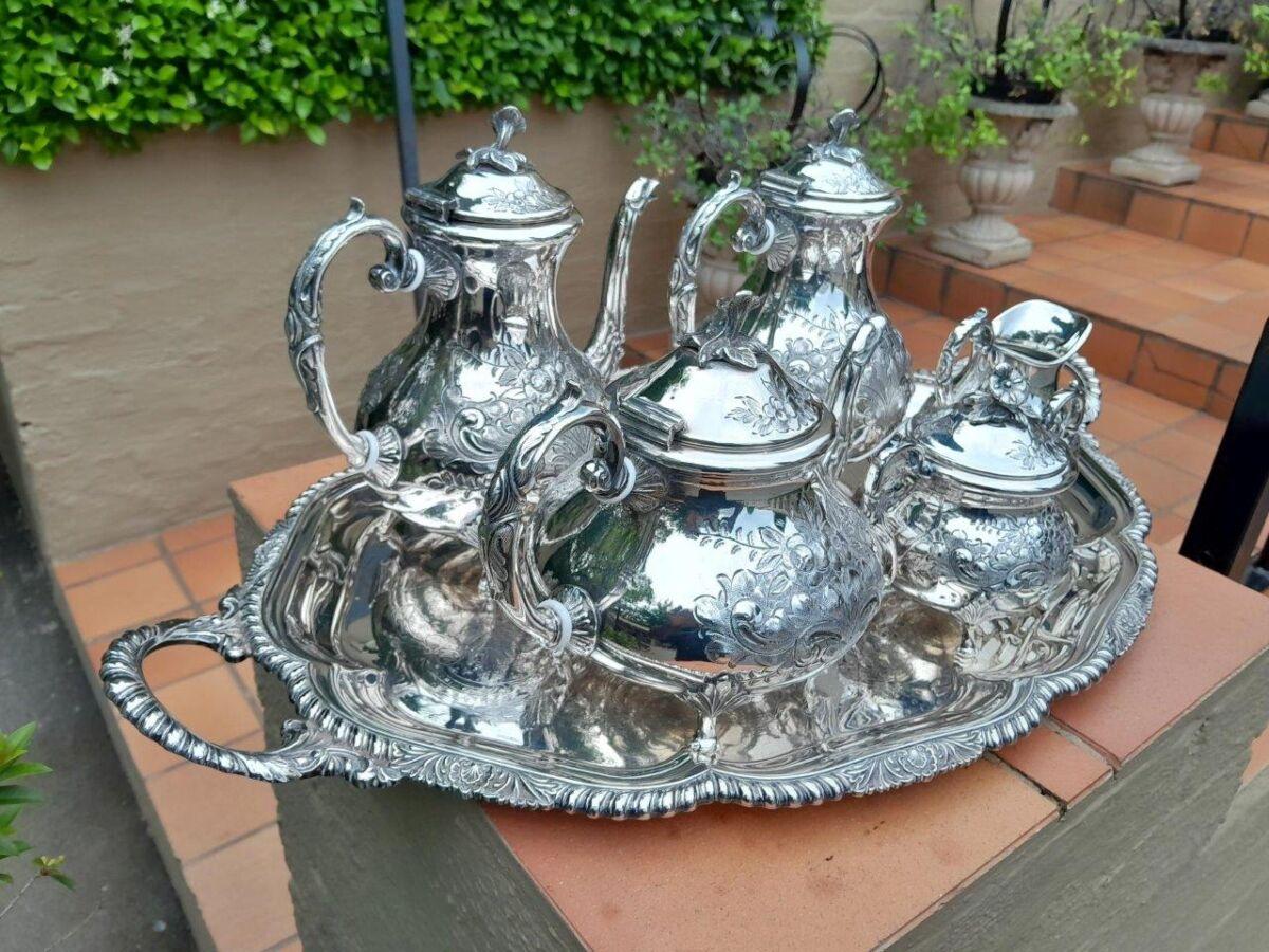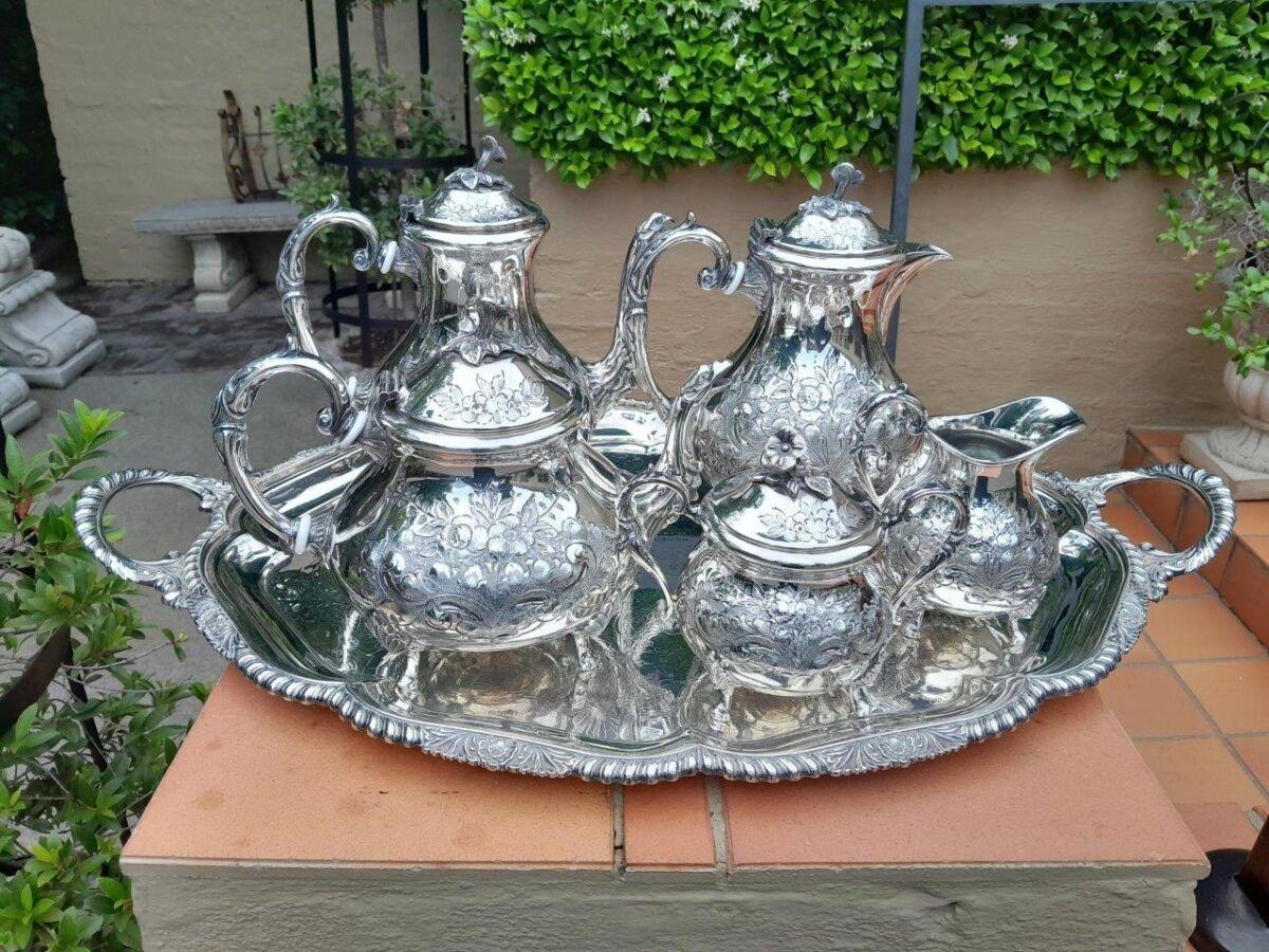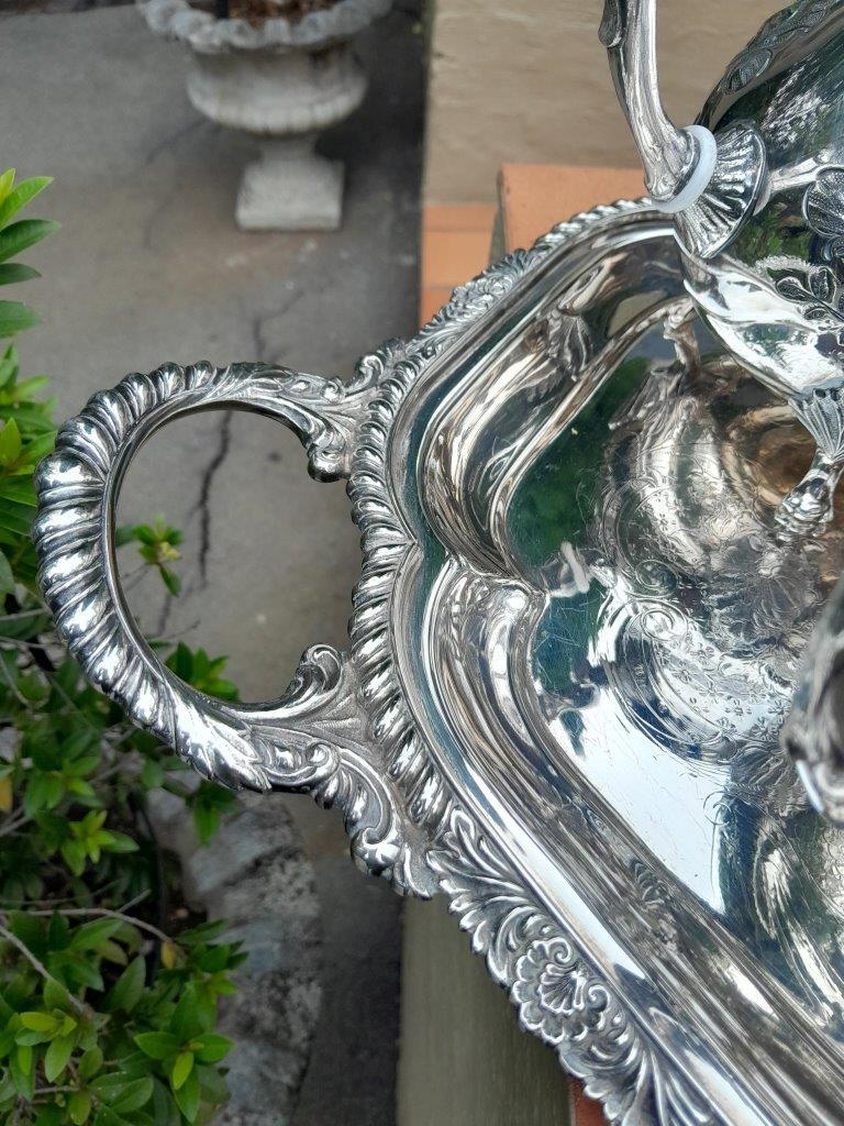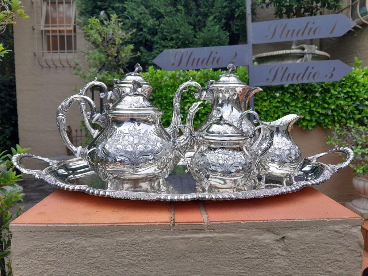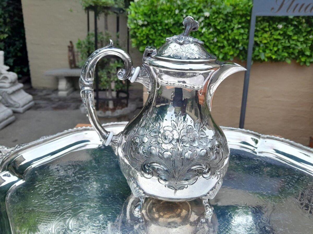 A 20TH Century John Turton Sheffield Five Piece Electroplate Tea Service With Tray (Comprising: A Teapot, Coffee Pot, Hot Water Pot, Milk Jug, Two-Handled Sugar Basin With Loose Cover) Tray 70cmw R23800