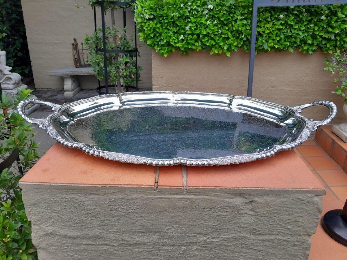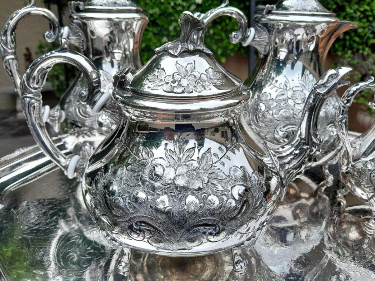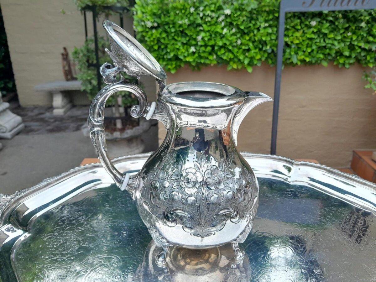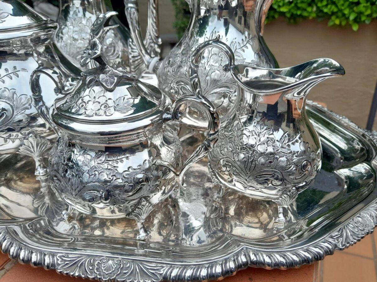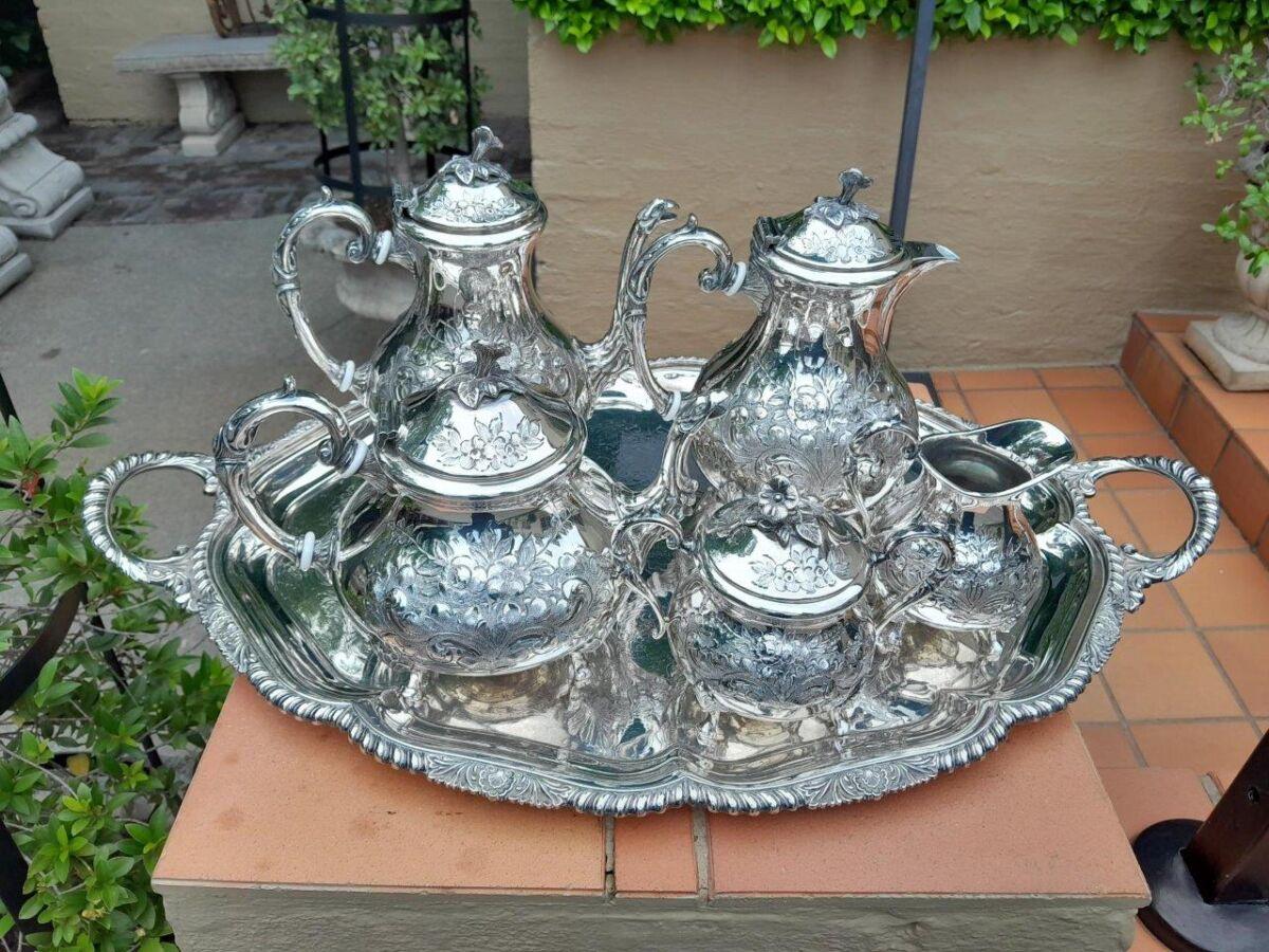 A 20TH Century John Turton Sheffield Five Piece Electroplate Tea Service With Tray (Comprising: A Teapot, Coffee Pot, Hot Water Pot, Milk Jug, Two-Handled Sugar Basin With Loose Cover) Tray 70cmw R23800