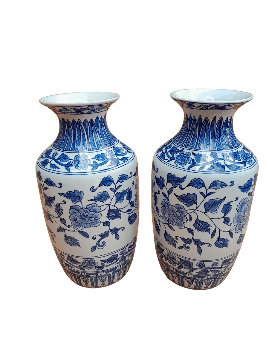 A 20th Century Pair of Blue / White Painted Ceramic Vases