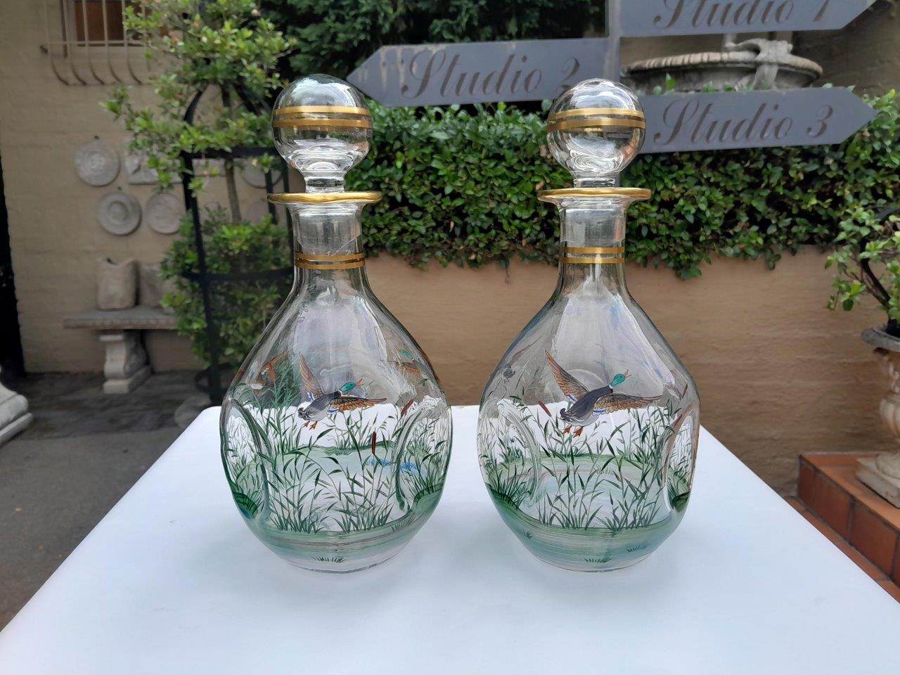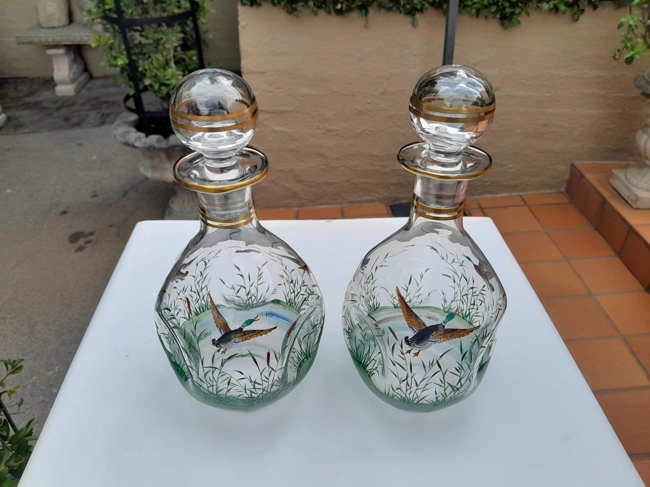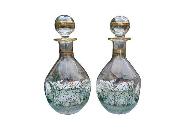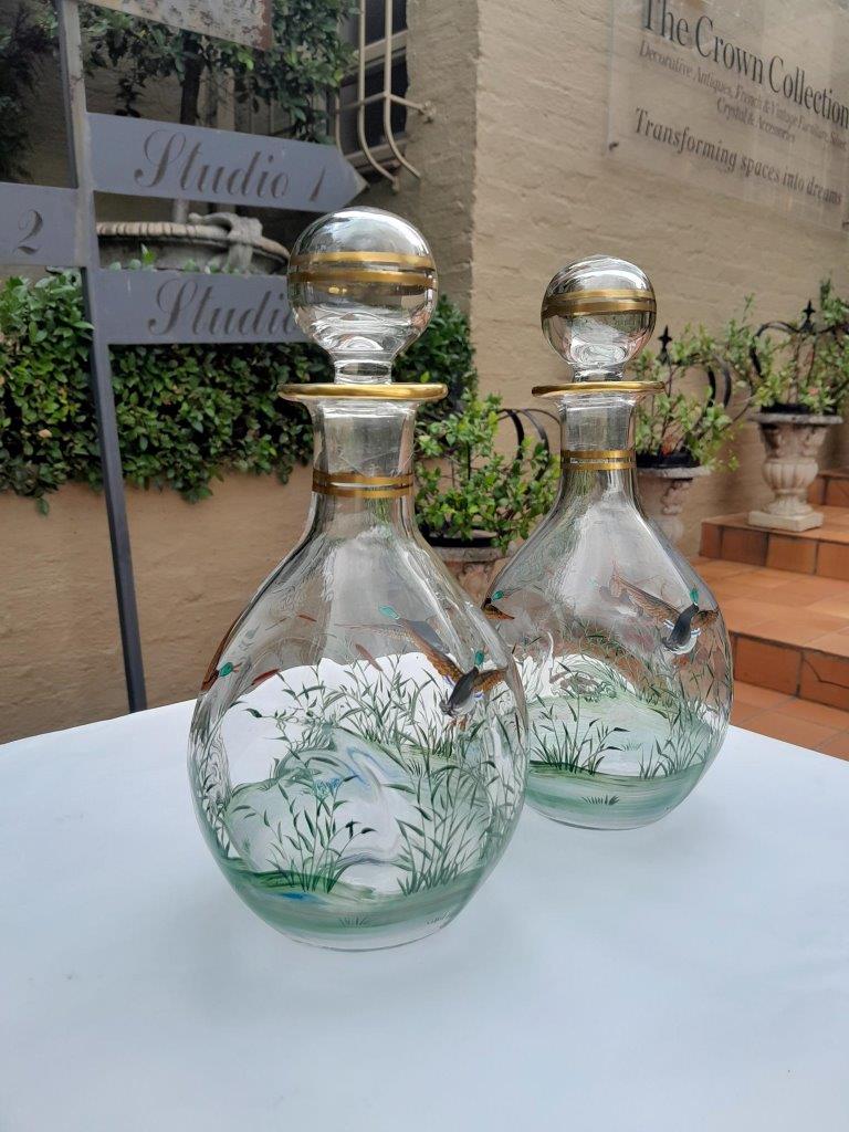 A 20th Century Pair Of Bohemian Decanters With Gilt Rings And Spherical Stopper And Hand Painted Geese And Reeds