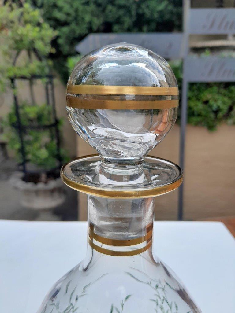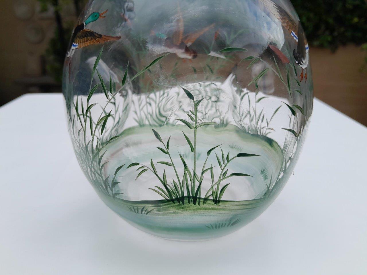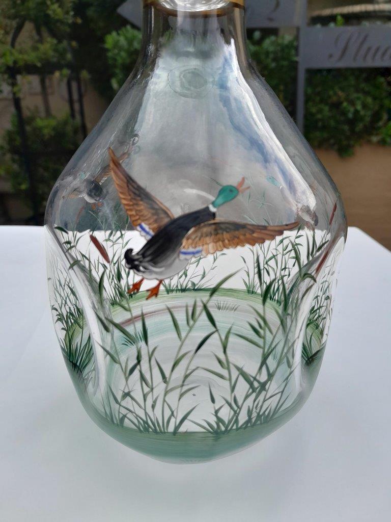 A 20th Century Pair Of Bohemian Decanters With Gilt Rings And Spherical Stopper And Hand Painted Geese And Reeds