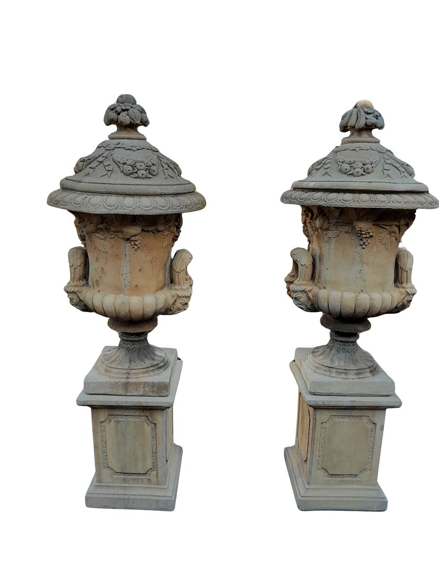 A 20th Century Pair of Large Decorative Concrete Urns with Lids on Plinths