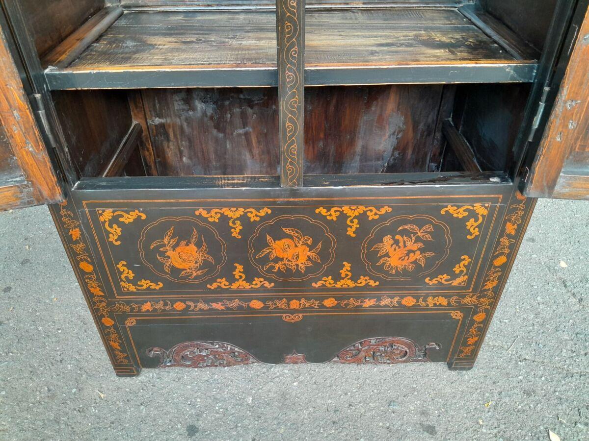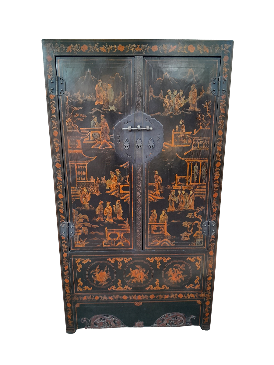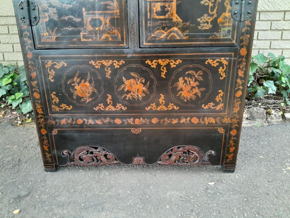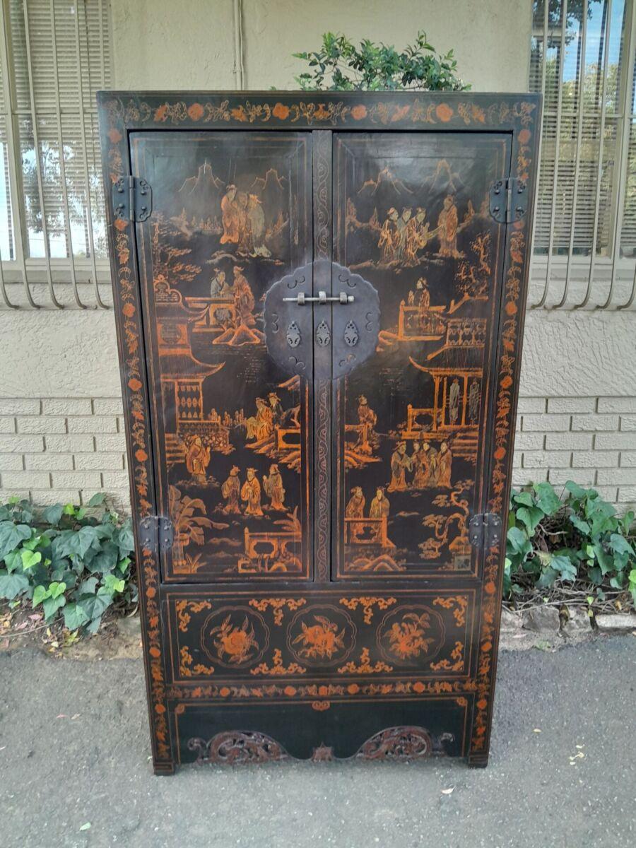 A 20th Circa 1950’s Chinese Style Cabinet With Black Lacquer Cabinet With Drawers And Shelf