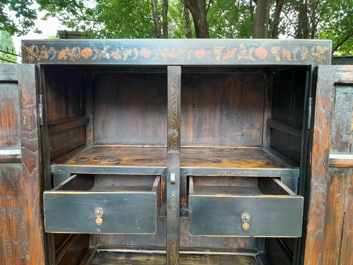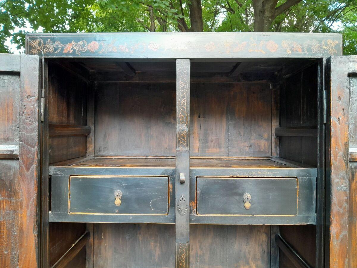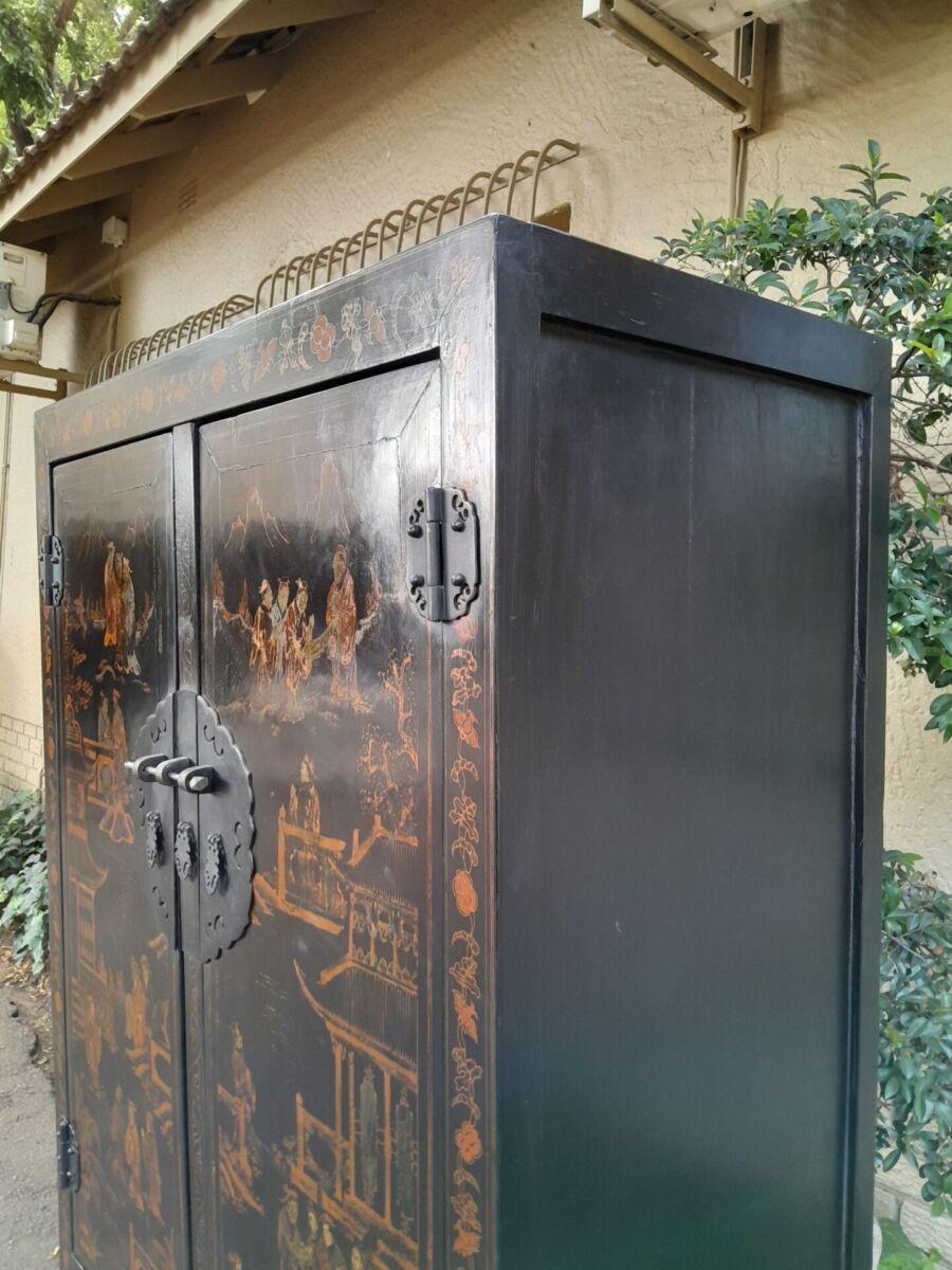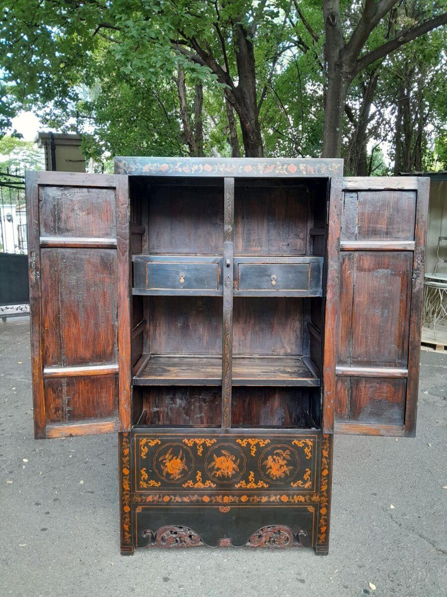 A 20th Circa 1950’s Chinese Style Cabinet With Black Lacquer Cabinet With Drawers And Shelf