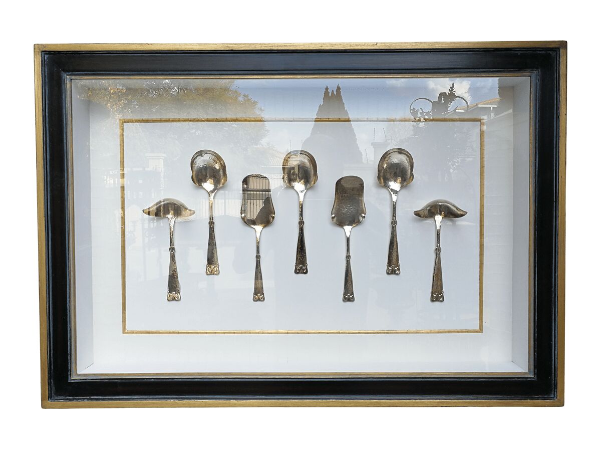A Collection of Silver Plate Serving Flatware Framed in a Hand-made Frame