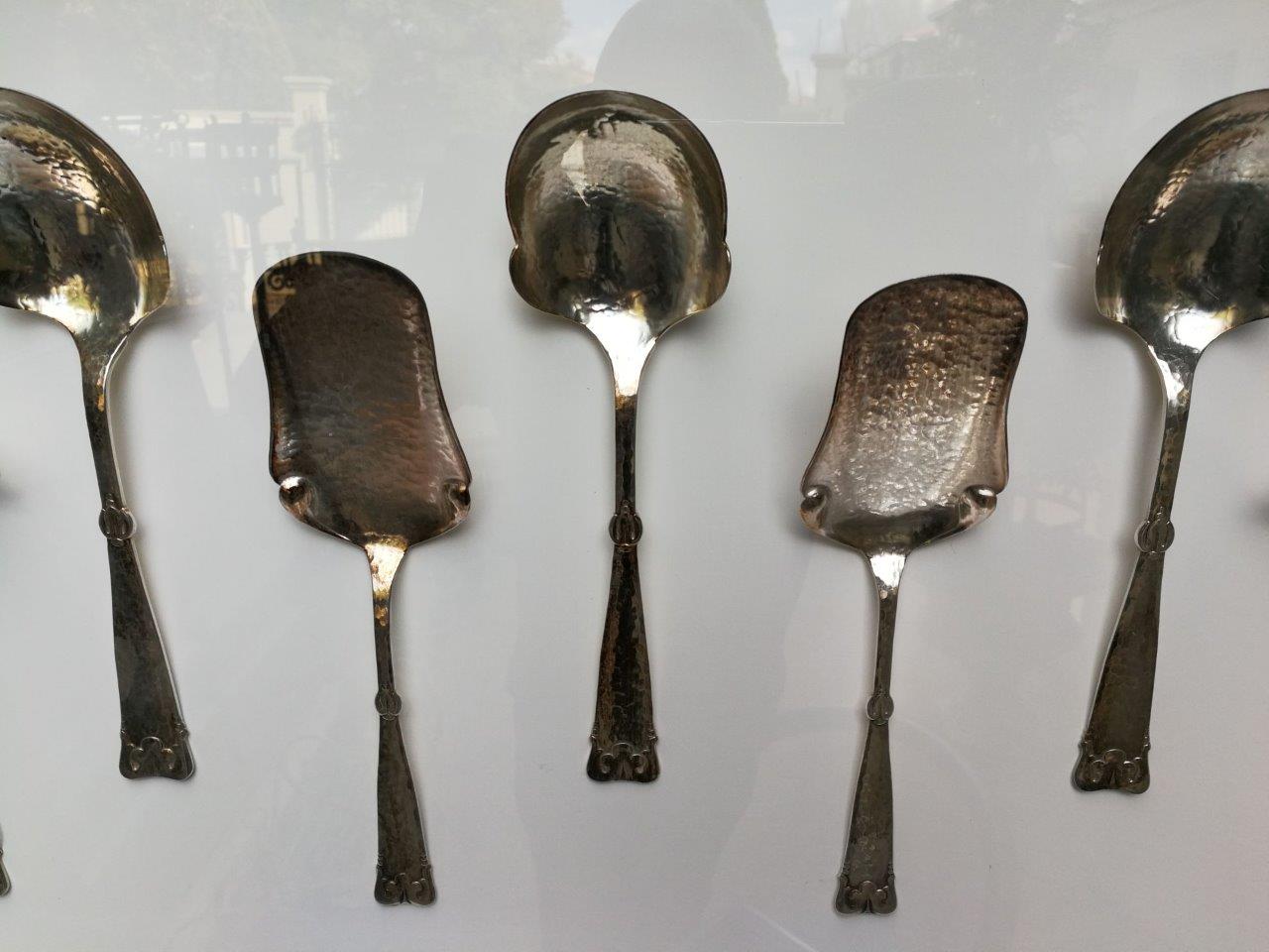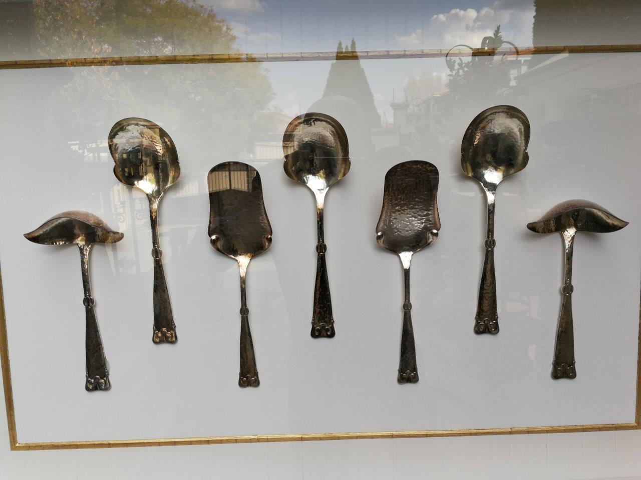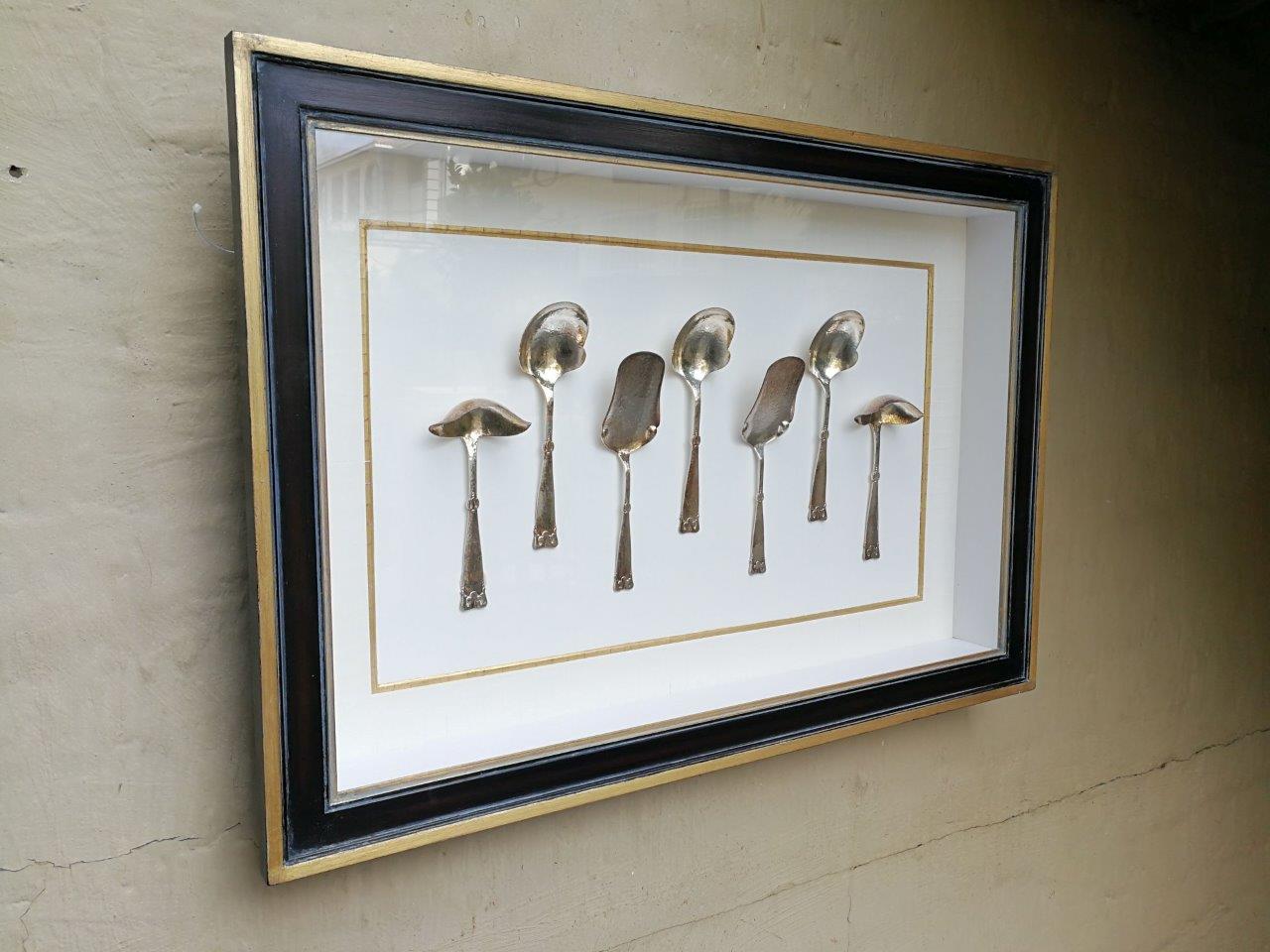 A Collection of Silver Plate Serving Flatware Framed in a Hand-made Frame