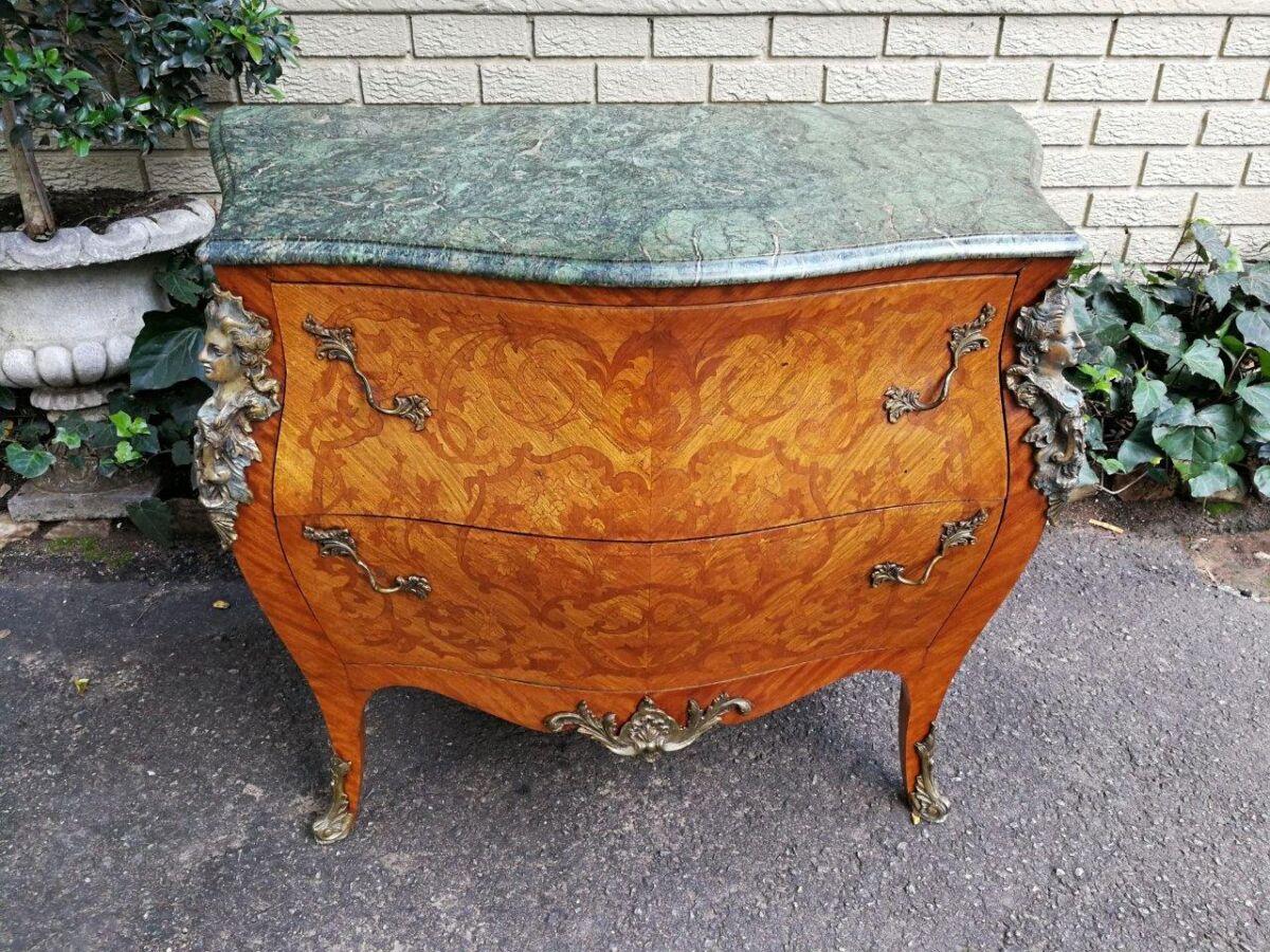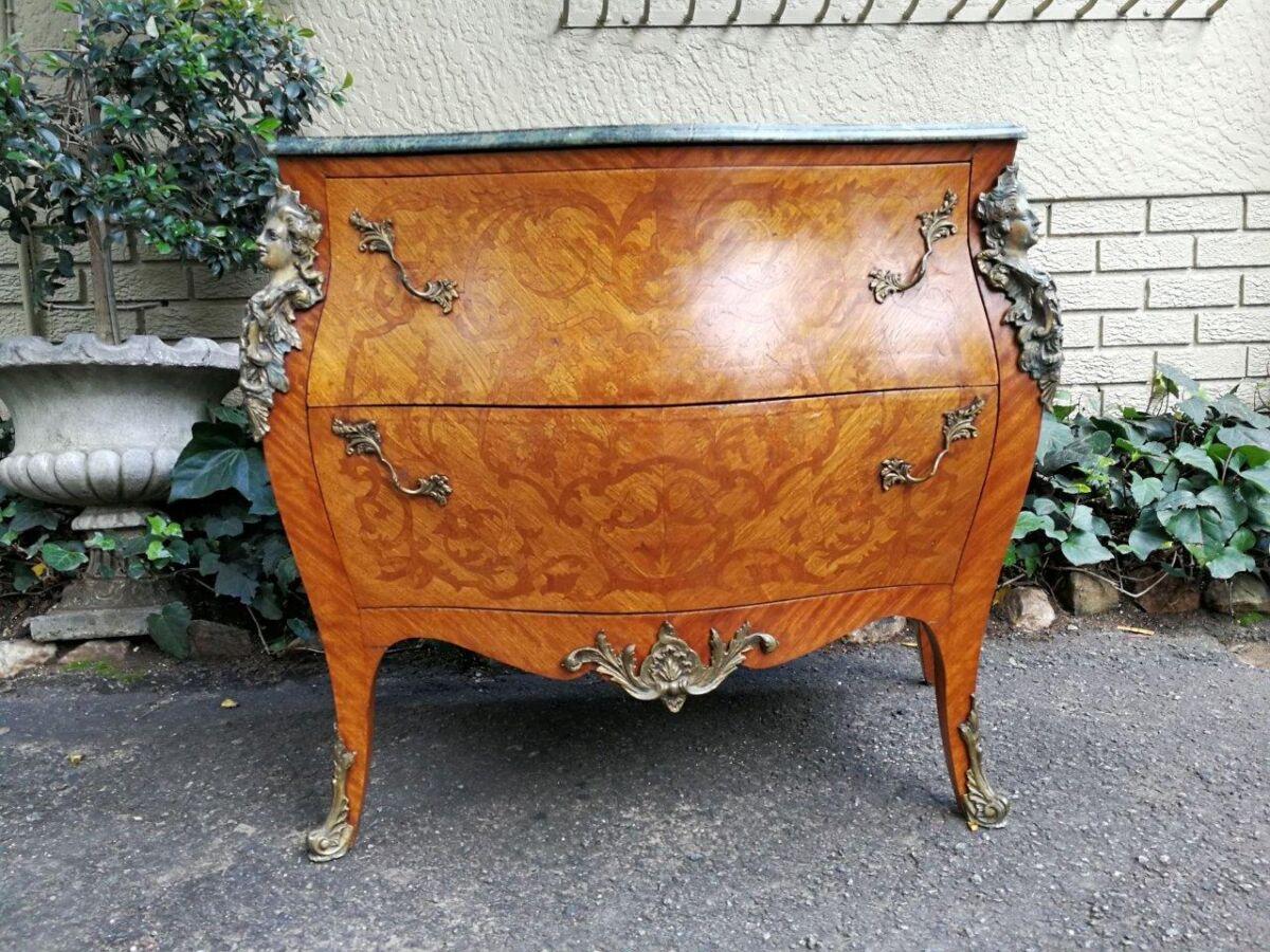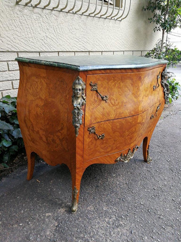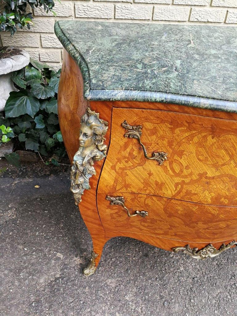 A Fine Figural Walnut Marble top Bombe Commode/Chest of Drawers with Ormolu brass mounts and Marquetry inlay
