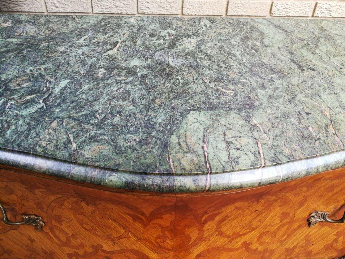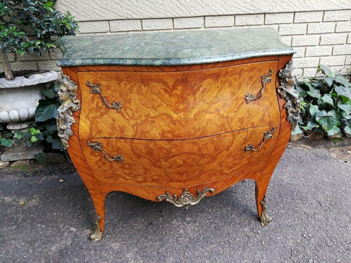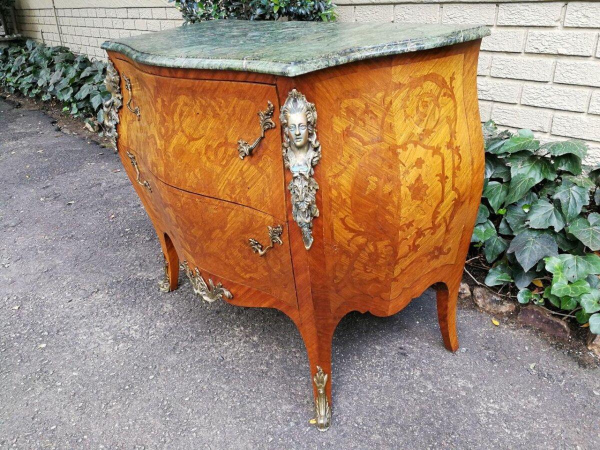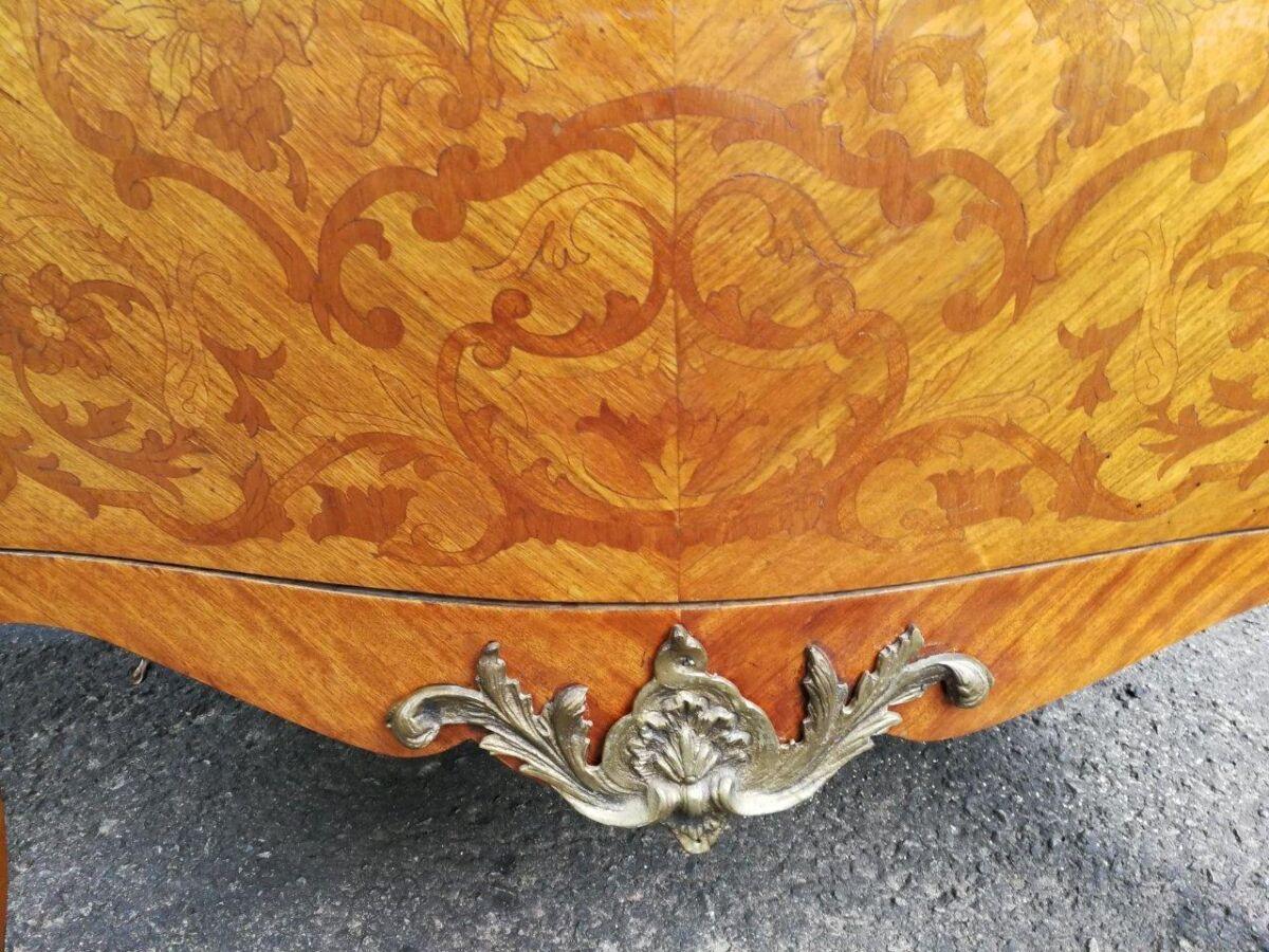 A Fine Figural Walnut Marble top Bombe Commode/Chest of Drawers with Ormolu brass mounts and Marquetry inlay