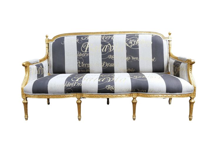 A French Antique Hand-Carved And Gilded Settee, Upholstered In A Hand Painted Imported Linen Fabric With Gold Script